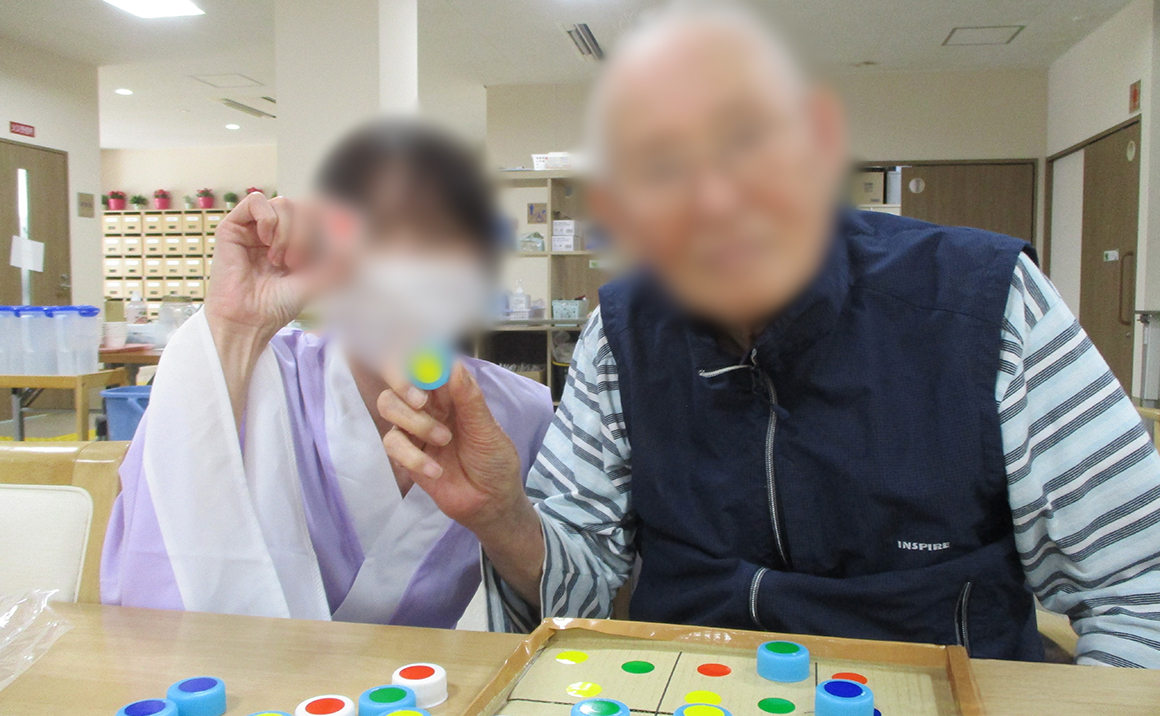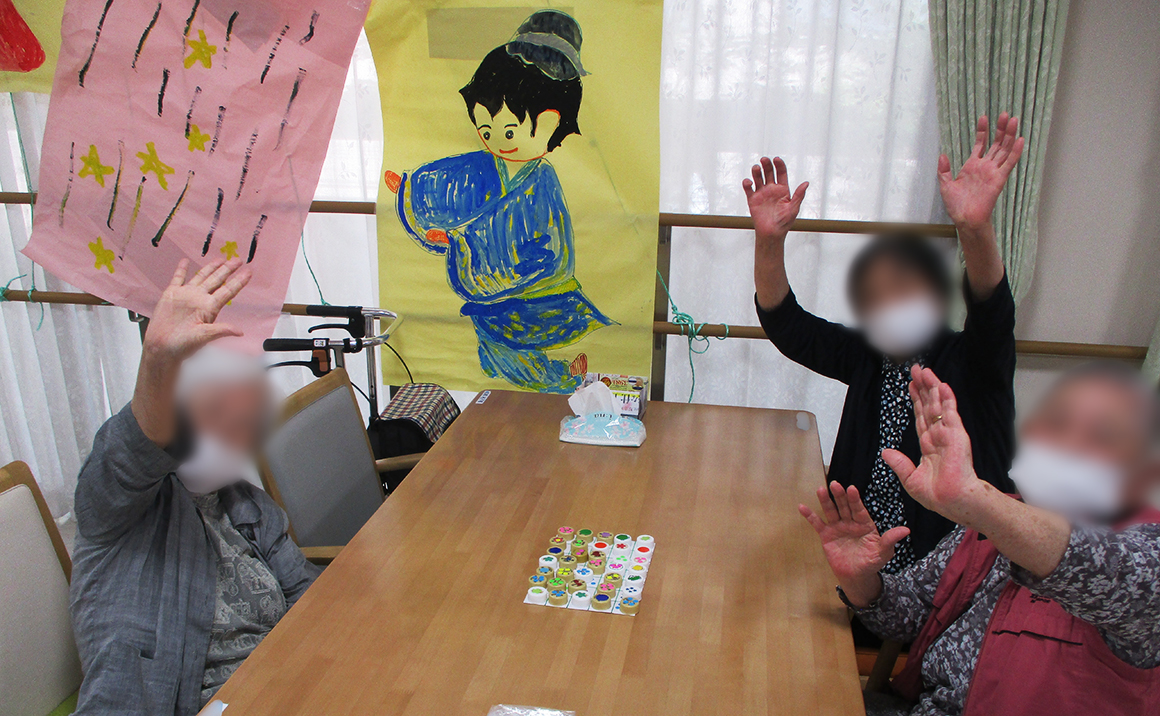7月6日(日)に七夕祭り・マスゲームをしました。 織姫に扮した職員と一緒にゲームをしながら写真を撮り楽しいひと時を過ごしました。 マスゲームは職員がペットボトルにキャップをたくさん集めて作りました。 キャップに色々な形や色等を貼っており、それと同じところに置いていきます。 皆様笑いながらも真剣に取り組んでおられました。 織姫が近くに行くと手を握ったり、いつもと違う職員に目を丸くしていらっしゃいました。