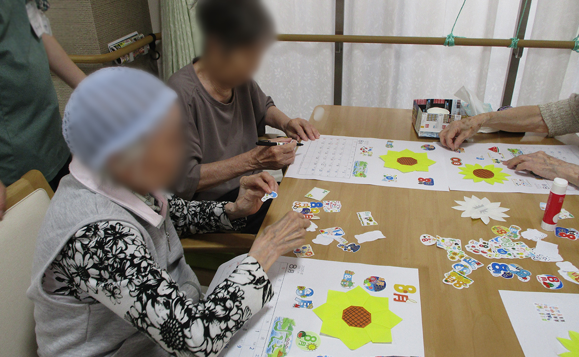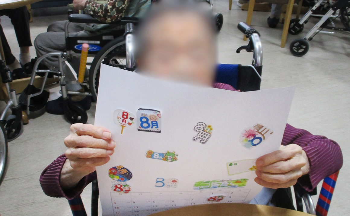 早いもので、もう7月が終わりに近づいて8月のカレンダー作成をしました。 皆様一生懸命作成しておられました。 完成したカレンダーを「見てみて、こんなん作れたよ~」「もう8月やって!早いね~」 「また部屋に貼ってもらお~」「あなたの見せて。ええやんか~」等お話が止まりませんでした。