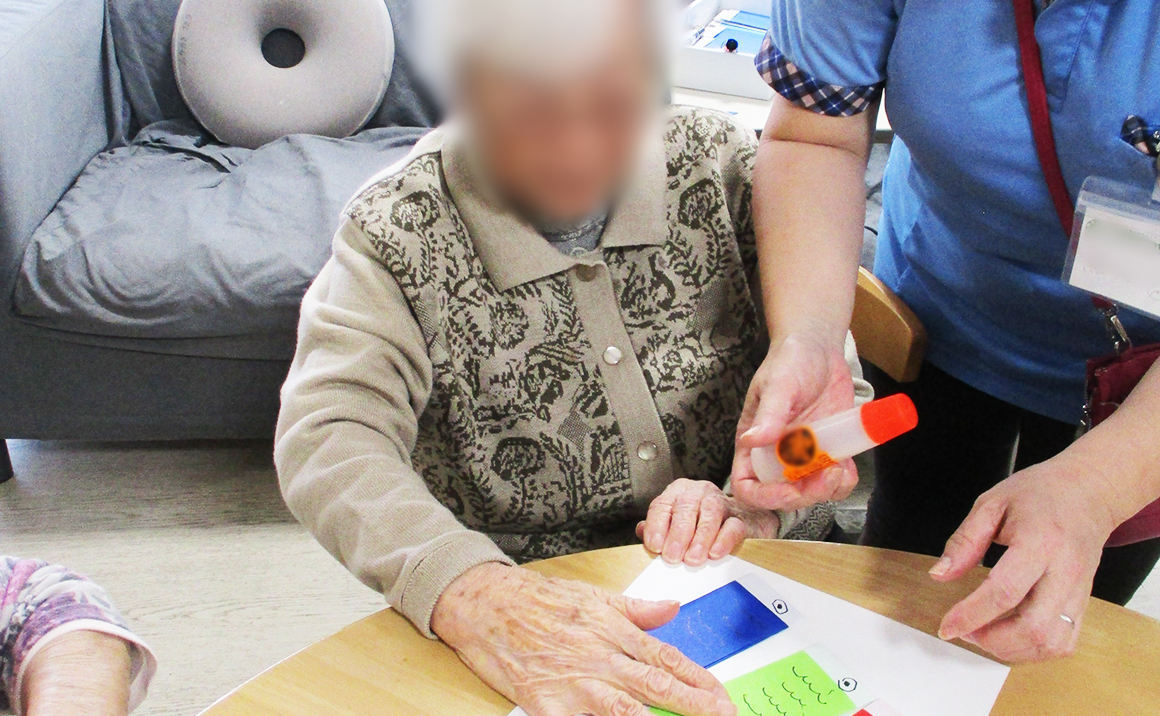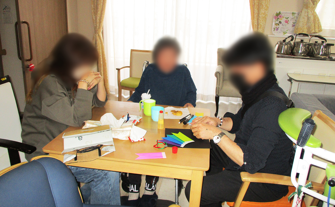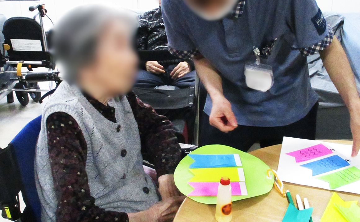 4月11日 本日は居室に飾る「こいのぼりのタペストリー」を作りました。 ちょうどご家族様も面会に来られていたので参加して頂き ご一緒に作成して頂きました。 皆様個性あふれるこいのぼりでした。 一度玄関前の壁に飾って頂き、その後居室に飾ります。
