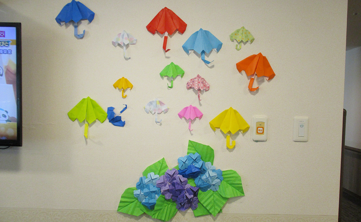 機能訓練指導員がリハビリの一環として取り組んでいる折り紙作りが好評です。 季節の花をテーマに楽しみながら丁寧に折っていらっしゃいます。 現在は七夕祭りに間に合うようにと短冊や星、提灯などの飾り付けを急ピッチで製作中です。 皆さま力を合わせていらっしゃいます。