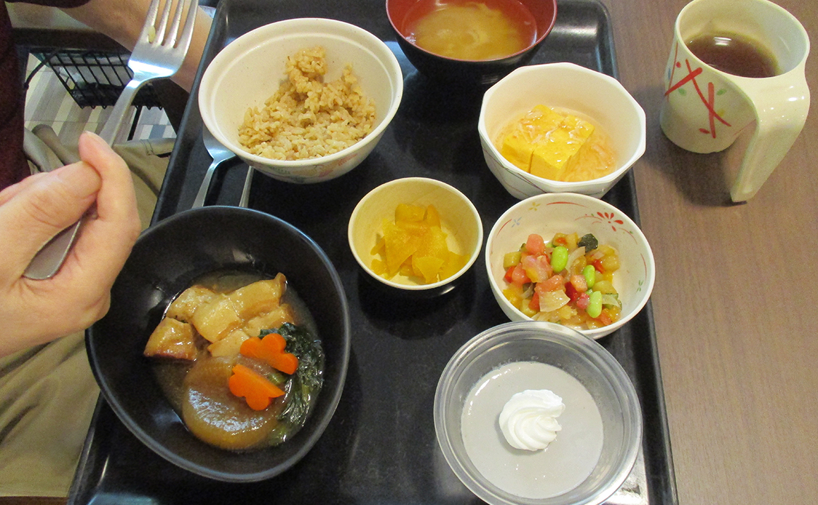 プレザンメゾン新大阪の食堂は、広々とした空間で中庭の草木を眺めながらゆっくりと食事を楽しんで頂けます。 第4日曜日にはご希望の入居者様に特別メニューのランチをご提供しています。 今回は「もち豚のやわらか角煮」です。 もち豚は限られた生産者によって育てられた越後のブランド豚で、柔らかくスッキリとした味わいが好評でした。