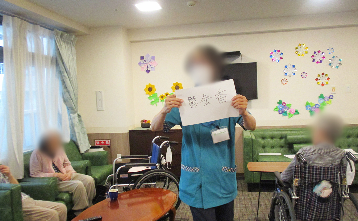 機能訓練指導員が認知機能訓練を定期的に実施しています。 今日は皆さま難読漢字にチャレンジされています。脳トレは難し過ぎると挫折しやすく簡単すぎると効果が薄れてしまうと言われています。 皆さまに楽しく参加して頂けるようにヒントやゲームを取り入れる工夫もしています。(指導員が手にしている難読漢字はチューリップです。)