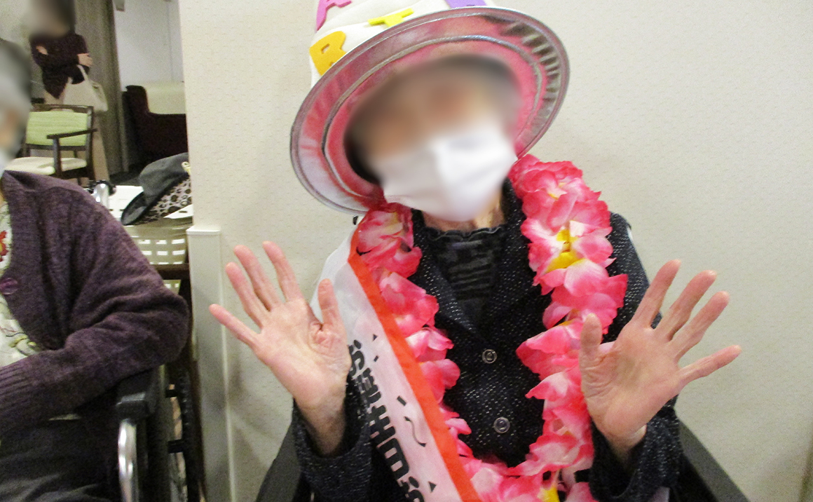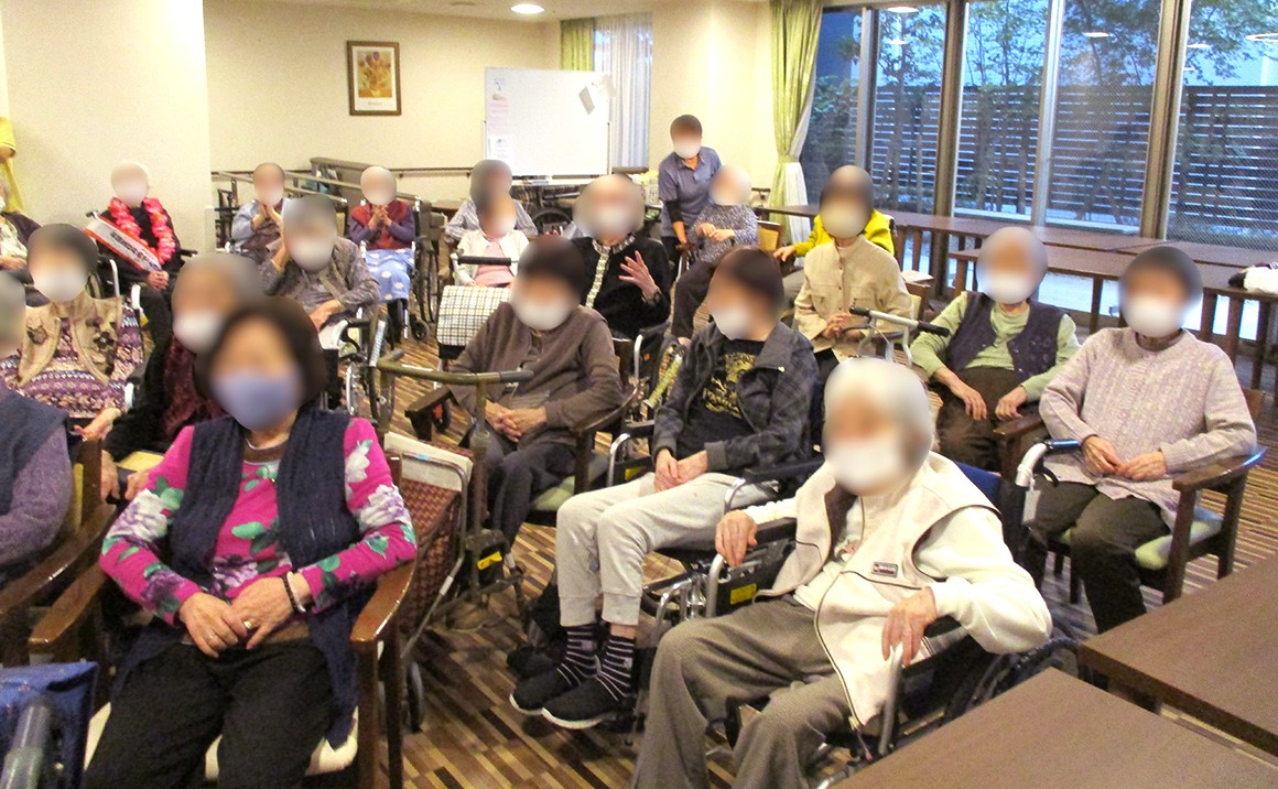 今回の合同レクリエーションは盛りだくさんの内容になりました。 ラジオ体操でウォーミングアップされた後、プチ運動会での玉入れやカラオケも楽しんで頂きました。 お誕生日を迎える方には皆様からハッピーバースデーの合唱があり記念写真もお撮りしました。