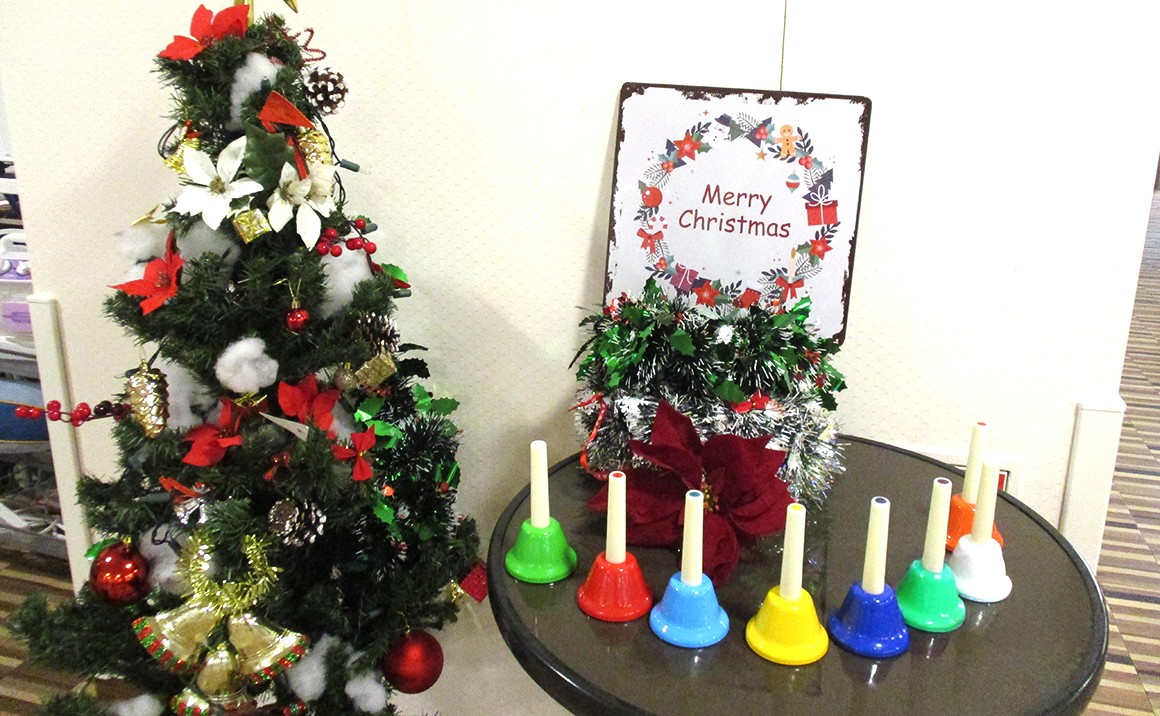 何かと気忙しい年末。寒い日も続きますがプレザンメゾン新大阪の紅葉はまだ綺麗です。 施設内はクリスマス気分でいっぱいですが、最後の紅葉をスマホで撮る方もいらっしゃいます。 現在、職員達はクリスマスパーティーに向けてミュージックベルの練習に励んでいます。 テーブルの上のカラフルなベルがミュージックベルです。 さて当日は上手に演奏出来るでしょうか。