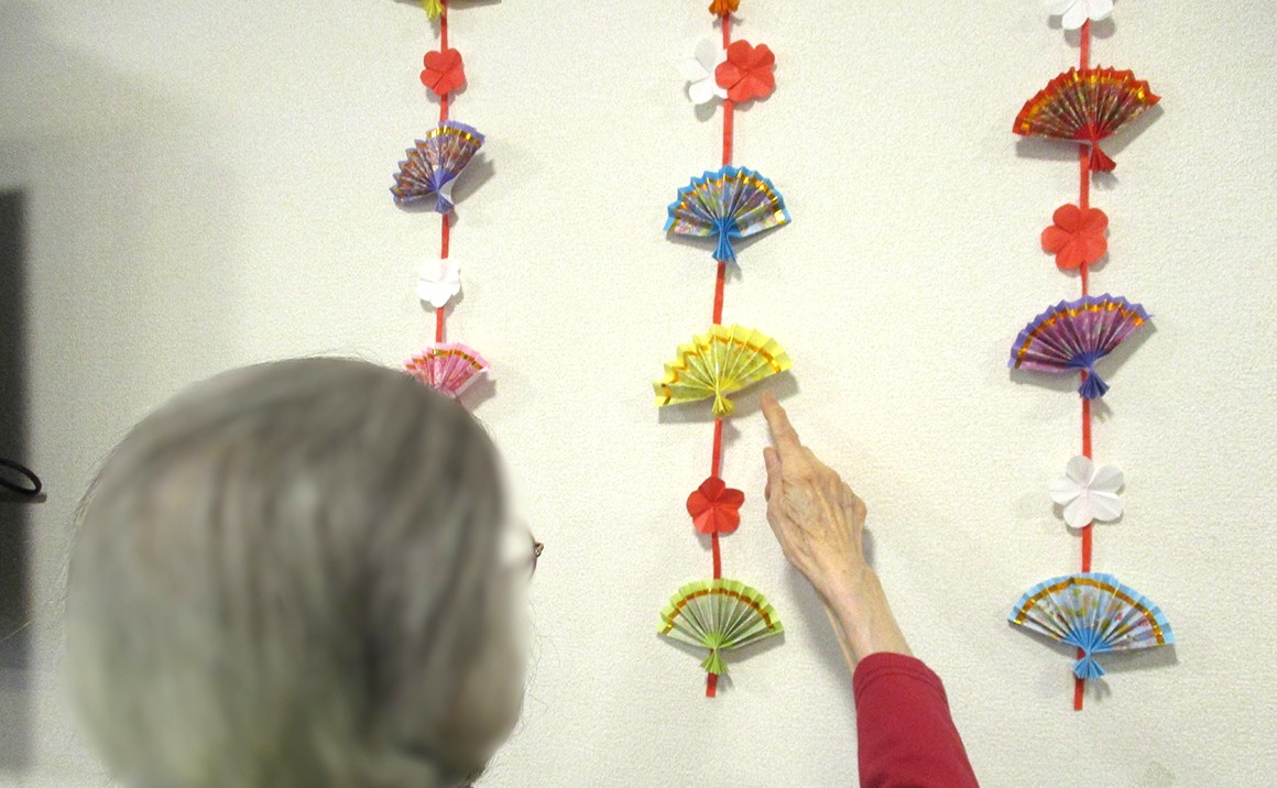 新年のレクリエーションは書き初め、福笑い、かるた、すごろく等でお正月気分を楽しんで頂きました。 書き初めはお好きな文字やユーモアのある言葉を自由に書かれ皆様の初笑いとなりました。 お正月飾りは折り紙です。昨年から皆様が丁寧に創り上げて下さいました。