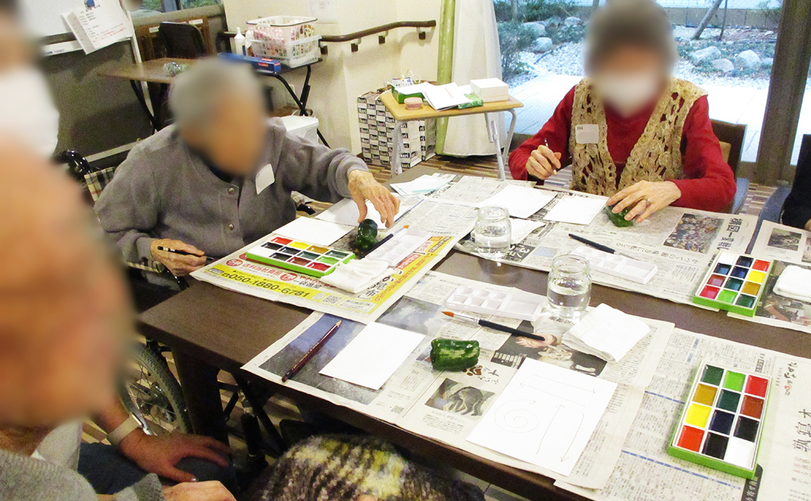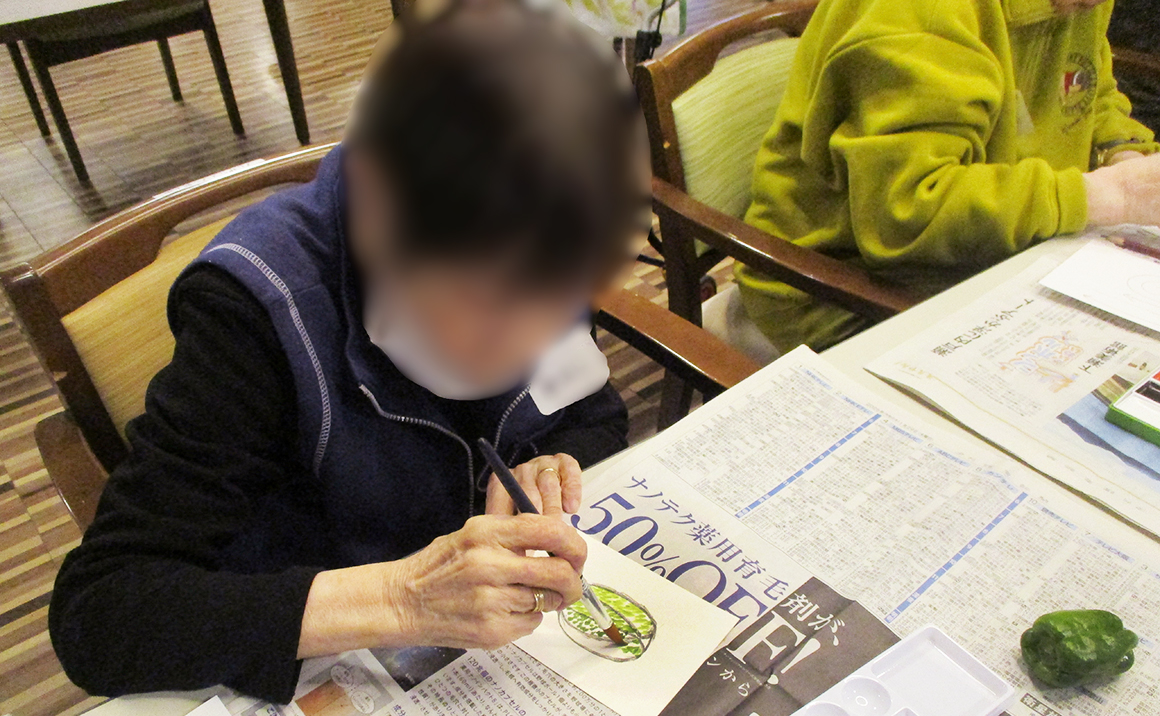 絵手紙の先生の指導のもと野菜のピーマンを描いて頂きました。色合いや形をじっくり観察しながら、