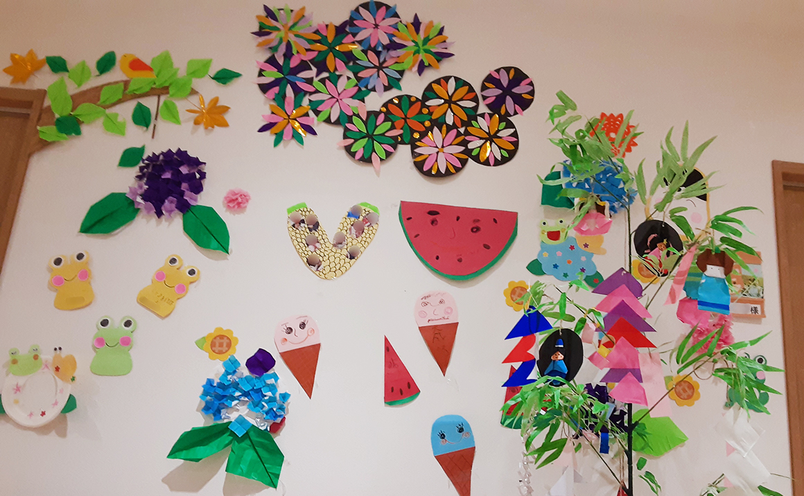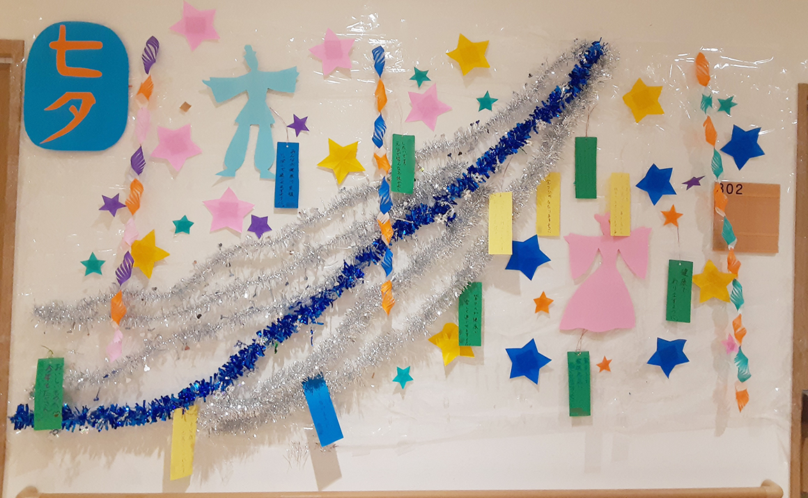 各フロアで七夕の飾り付けをして利用者さまにお願い事を短冊に書いて頂きました。 皆さん、『健康』『いつまでも美味しく食べたい』『家内安全』『皆の幸せ』など真面目な短冊でいっぱい☆ スタッフは『宝くじが当たりますように』『禁酒』など少し笑ってしまうような短冊がちらほら(笑) 楽しい新深江は今月も和気あいあいです☆