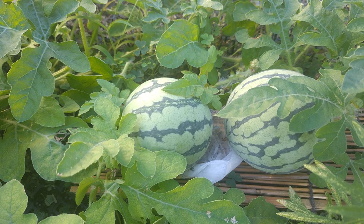 地域の方達と一緒にスイカを育てています。今年も小ぶりのスイカが成長中!