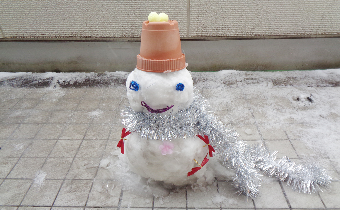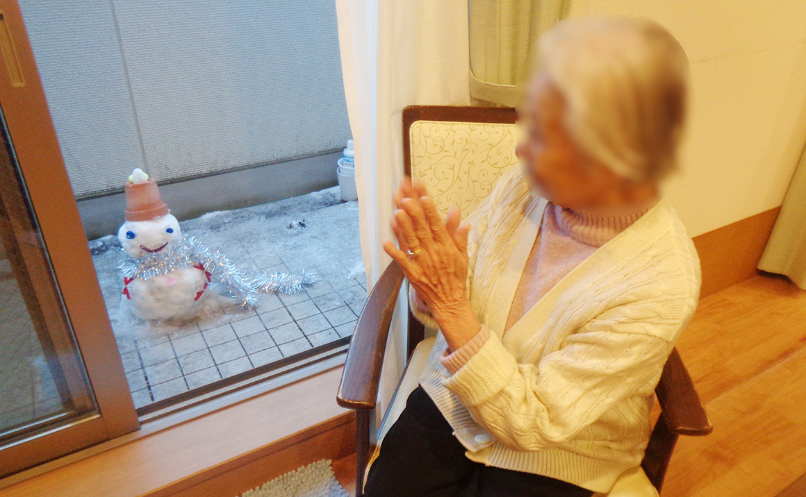 そしてカーテンを開けると、可愛い雪だるまが表われました。 「あら~」と目を細める入居者様。