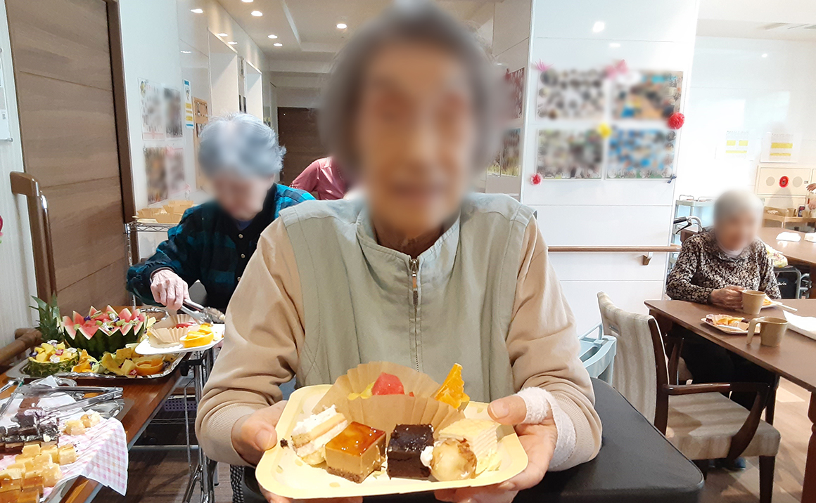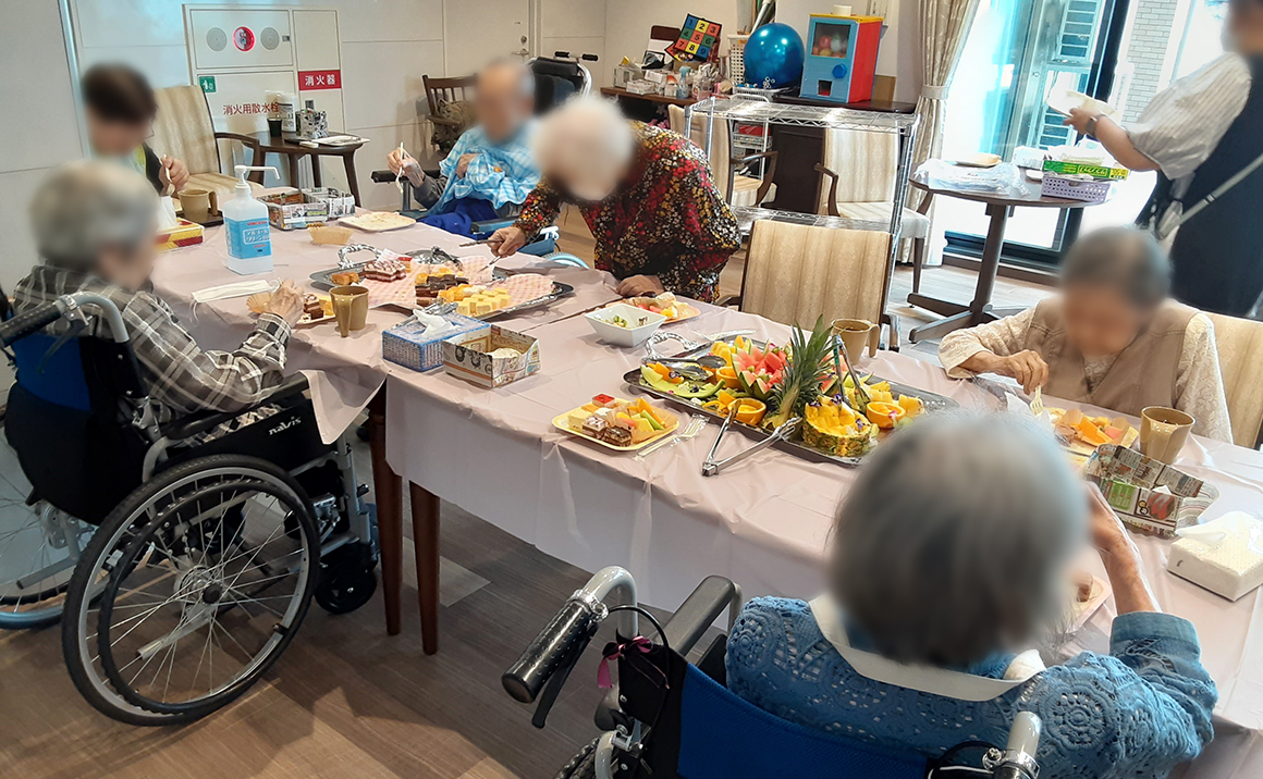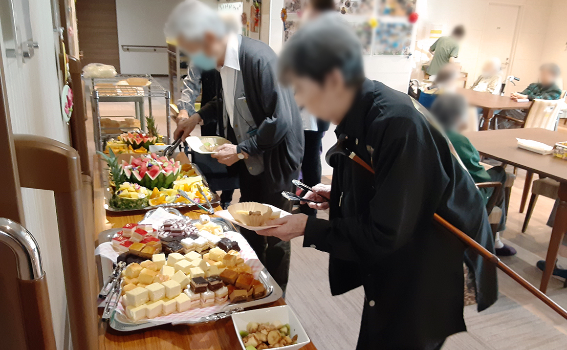 普段あまり食べる機会がないので果物が食べたい!との要望があり、イベントを開催しました! 季節の果物と一口大のカットケーキをバイキング形式で召し上がって頂きました☺