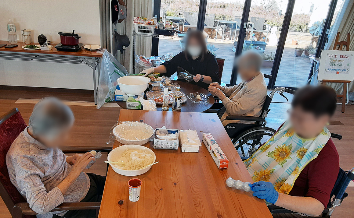 それぞれ分担して材料を切ったり、ごはんをおにぎりのように丸くしたり、デザートの材料を混ぜたり、皆さんで協力してお食事を作りました☺