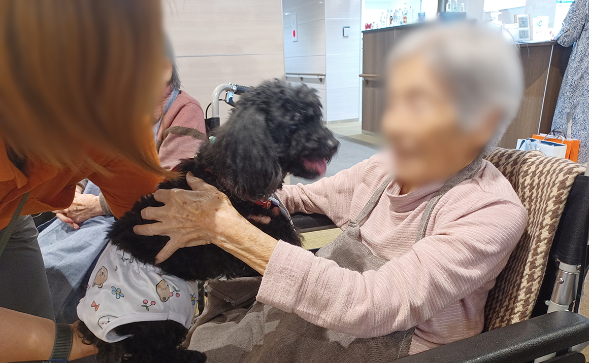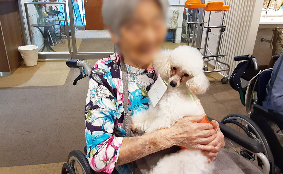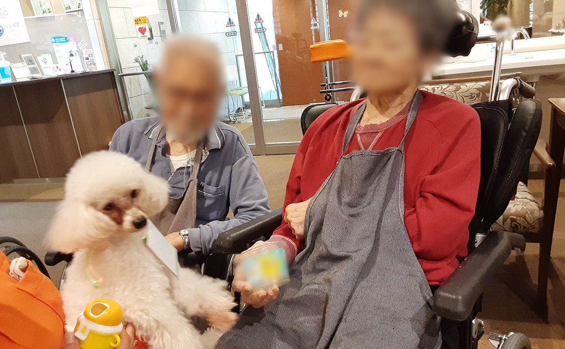 恒例のアニマルセラピーを実施いたしました♪ 今回も二匹のわんちゃんが来てくれました🐶 白いわんちゃんはひろしくん、黒いわんちゃんはクロエちゃんです。