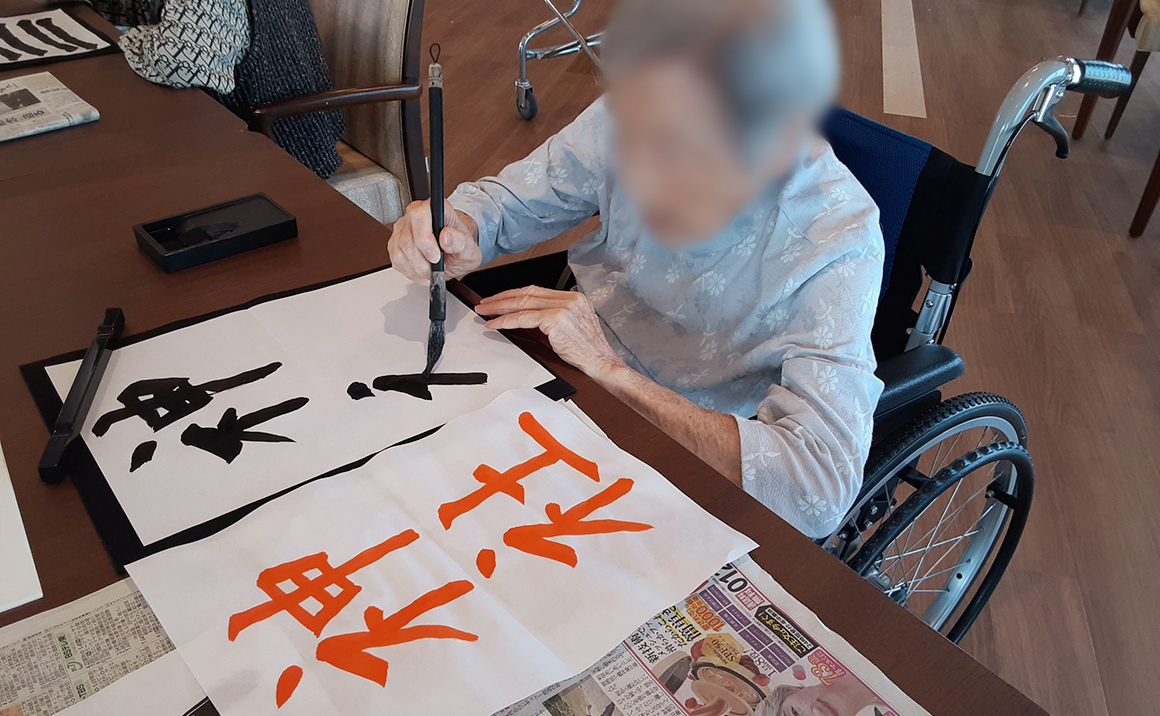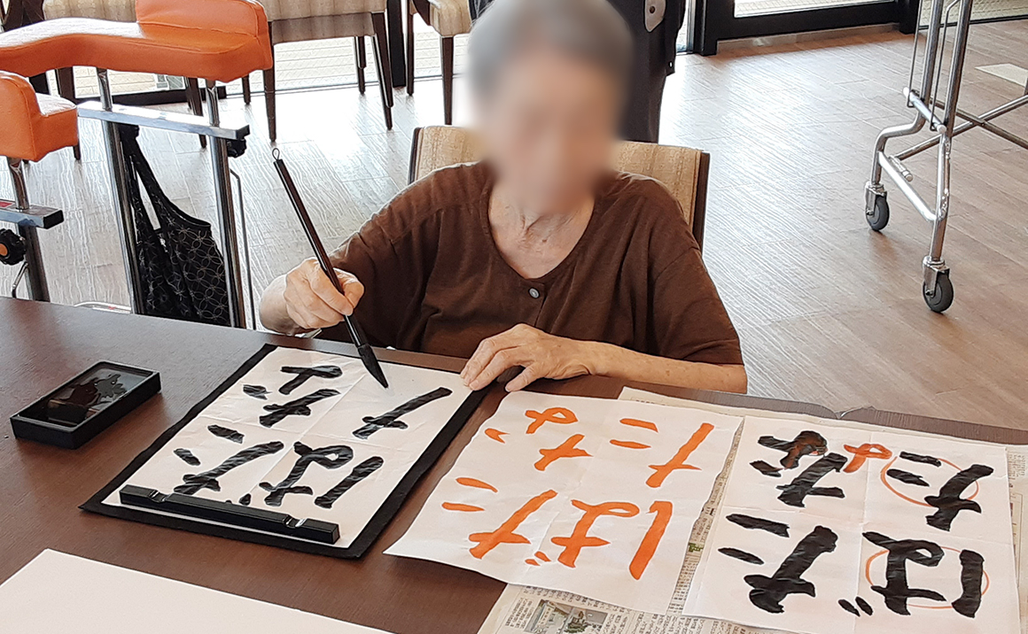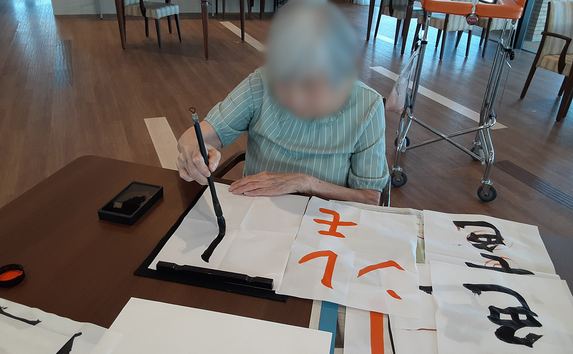月に一度先生にお越しいただき、習字を習うというより、習字を楽しんでいただくことを目的としています。