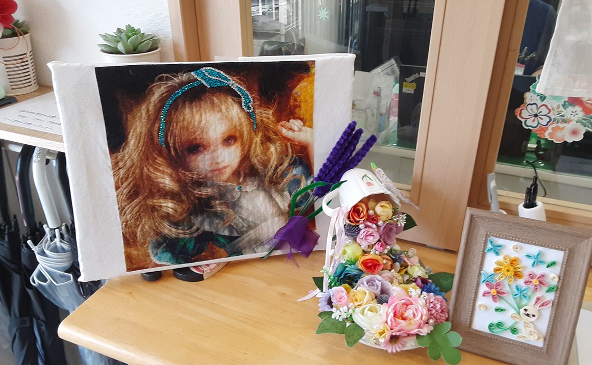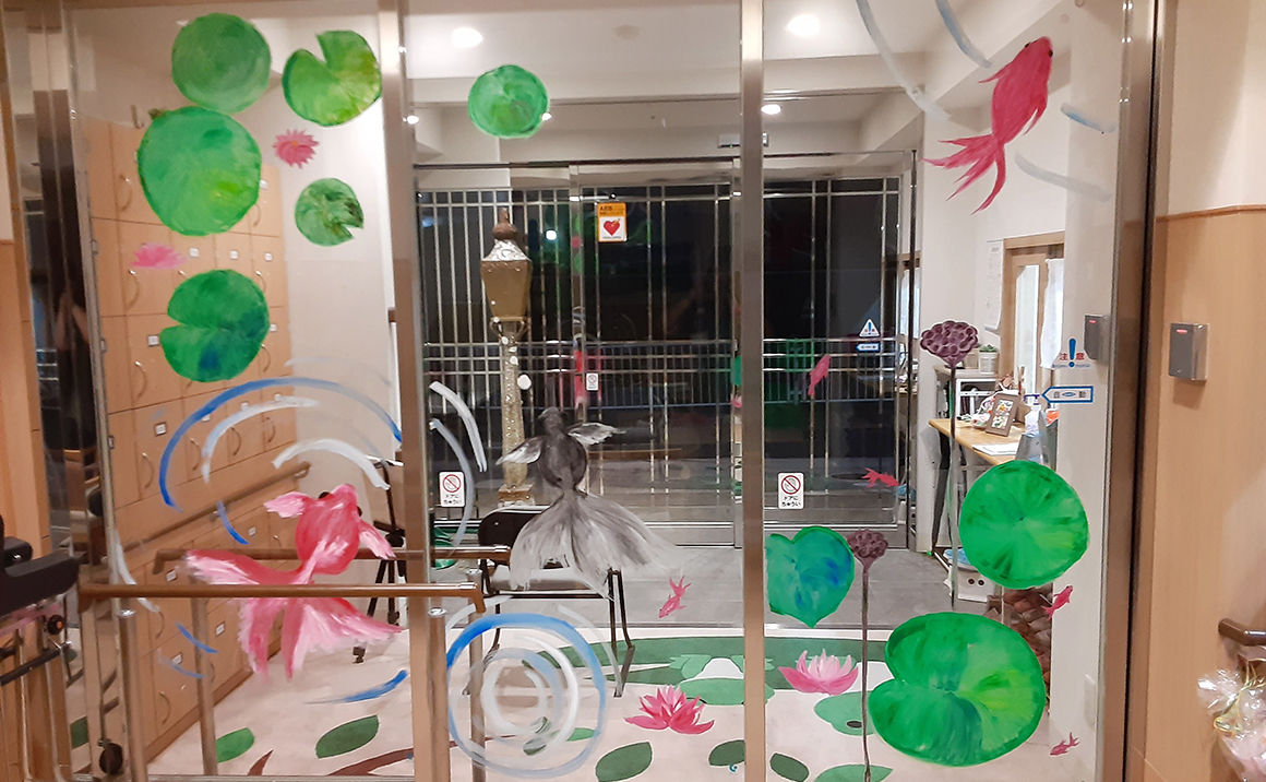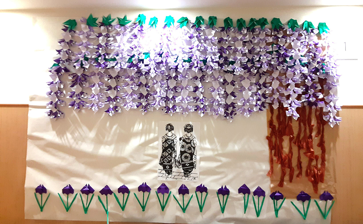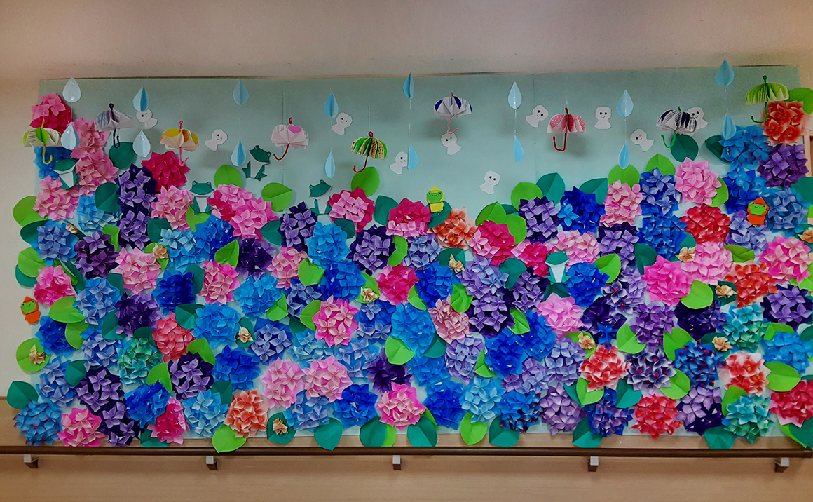 利用者様が書かれてた絵、俳句、塗り絵などを展示してみました。 恥ずかしいと仰る方もおられましたが、いざ展示すると喜んでおられました。 職員が季節を感じれる金魚の絵を自動ドアに書き、観るたびに夏と涼しげな泳ぎを感じます。 エレベーター前には少し時期が外れましたが藤野花が満開です。 食堂では梅雨を感じて頂きたい為、紫陽花、カエル、てるてる坊主、傘などを折り紙で職員が作って下さいました。 とても利用者様に喜んでもらい、制作に関わったスタッフは喜んでおられました。