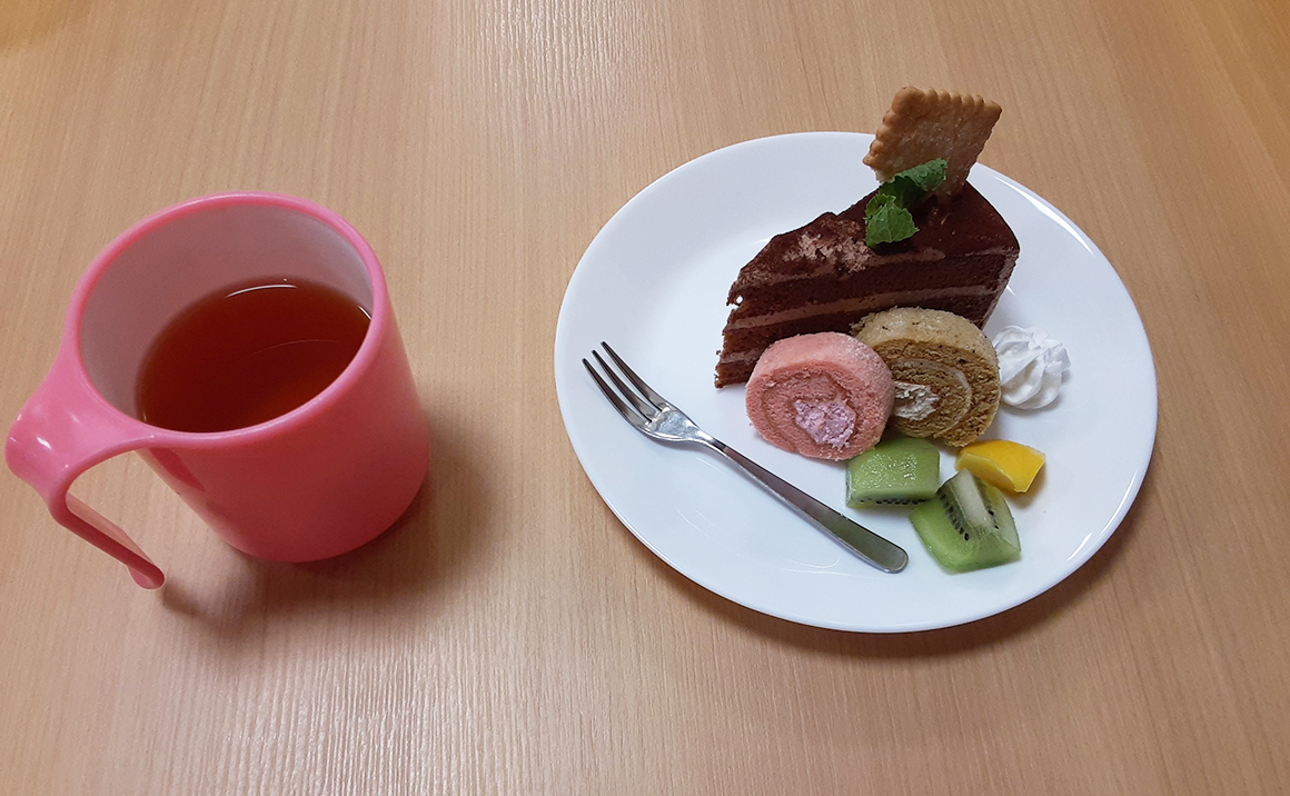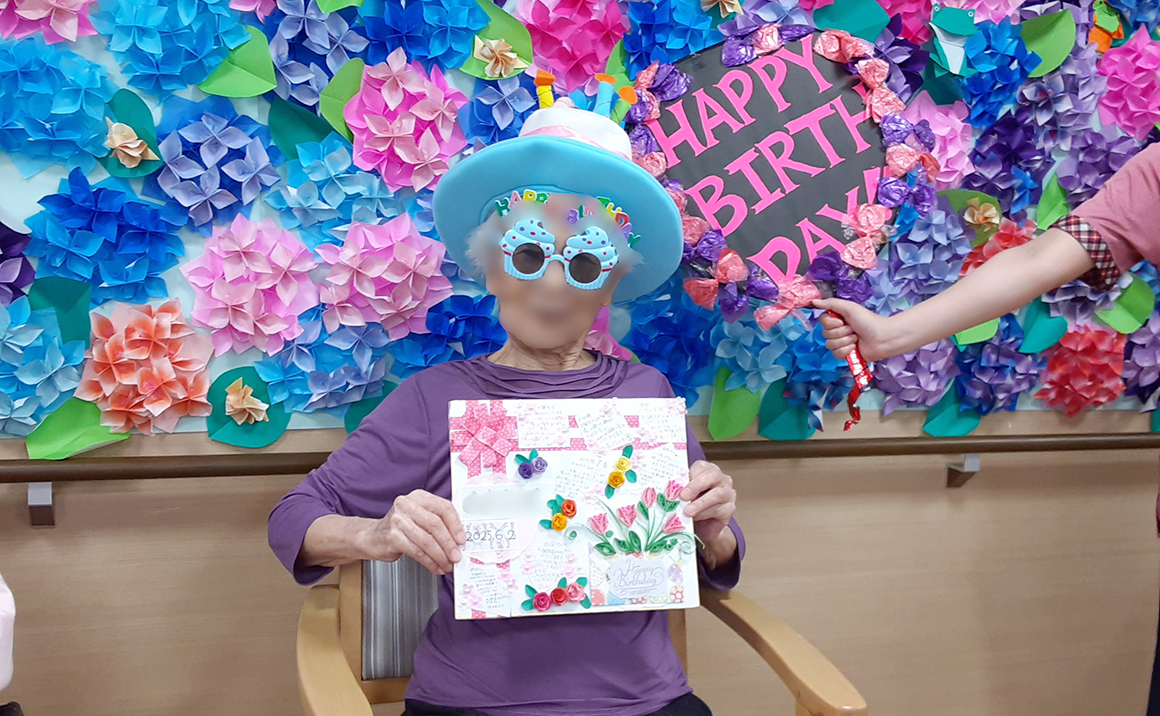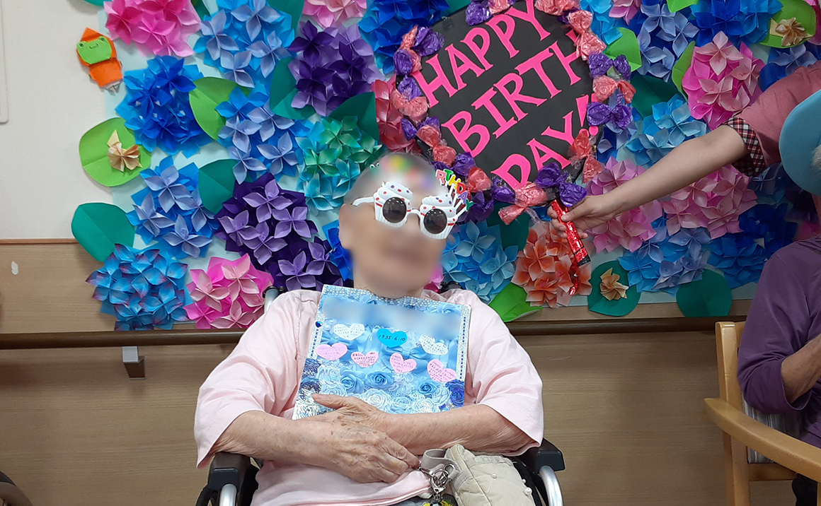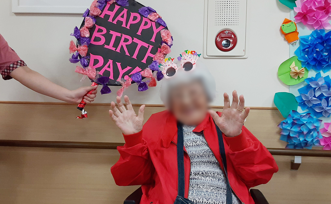 お誕生日会の開催前にポンポン体操しました。 楽しそうに利用者様と交わるようにスタッフも参加してくださいました。 いつもの体操より盛り上がり、ポンポンを持つだけで「楽しい気分になるわ」と仰る方もおられました。 体操後は6月のお誕生日会♪6月は女性3名でした。 お誕生日カードをもらうとすごく喜ばていました。 デザートのお誕生プレートもすごく喜ばれ、「お腹いっぱいになった」との声が多く、夕食を配膳しても「まだお腹いっぱいでご飯食べれない~」方が多かったです。