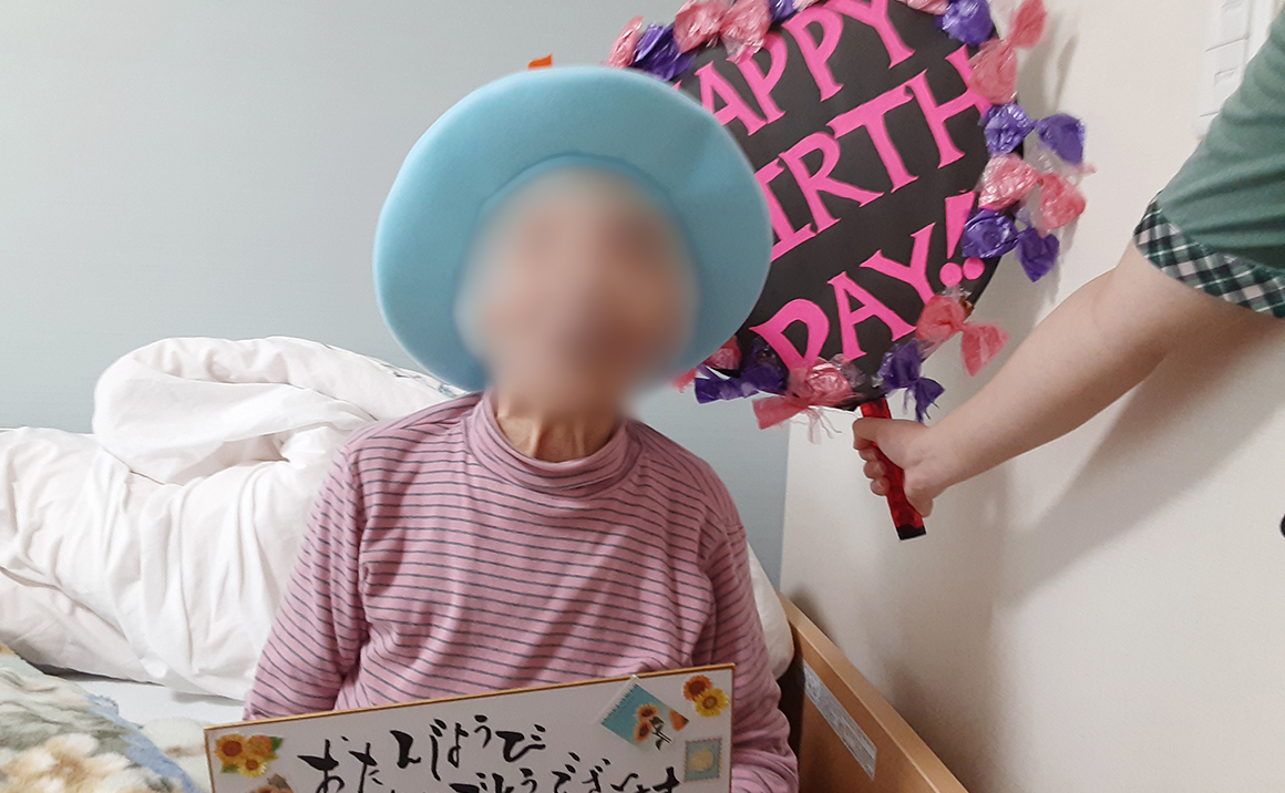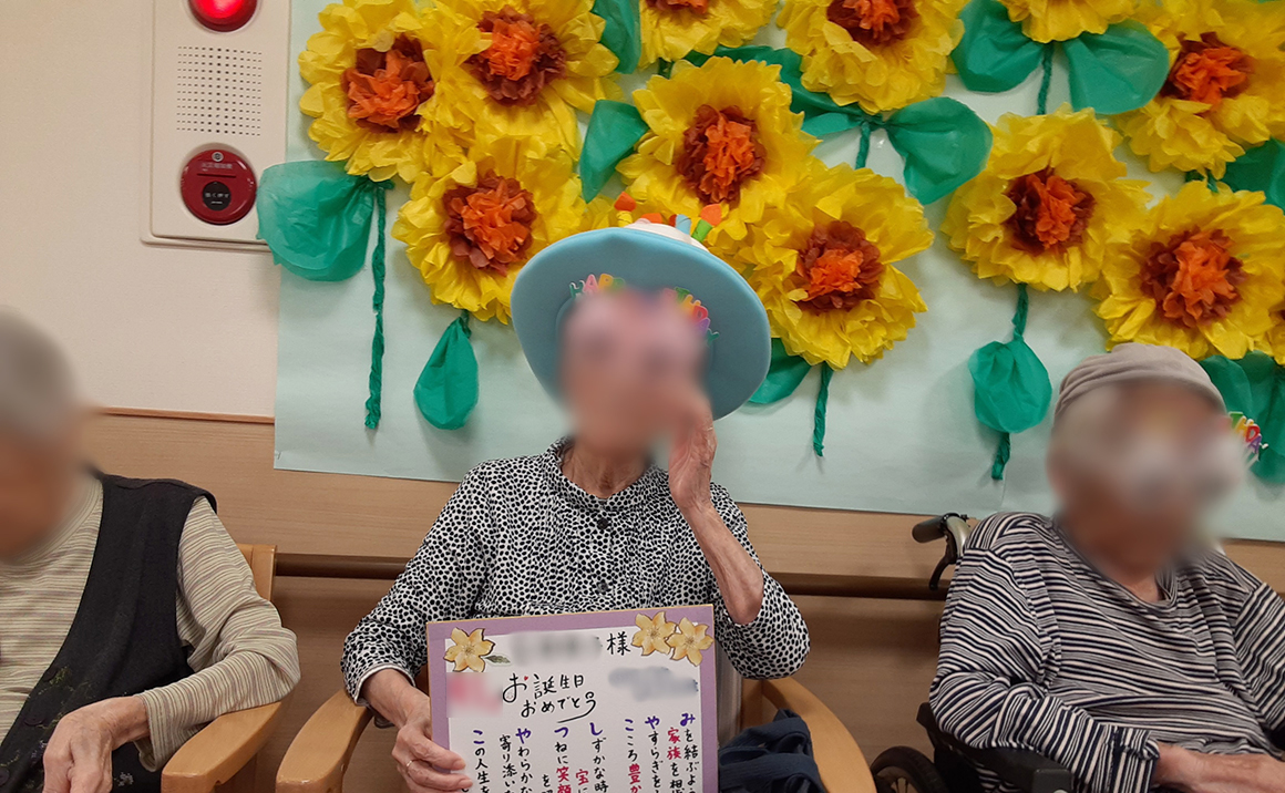 今月の誕生日会は8月・9月合同で開催しました。 8月の誕生日の方 女性6名、9月のお誕生日の方 女性1名でした。ちなみにスタッフは女性4名でした。 お誕生日おめでとうございます! お元気な方が多いですね! お誕生日の方、お誕生日以外の方も笑顔いっぱい楽しくされておられました。 誕生日プレートも皆様、美味しく召し上がれていました。