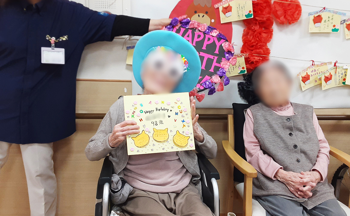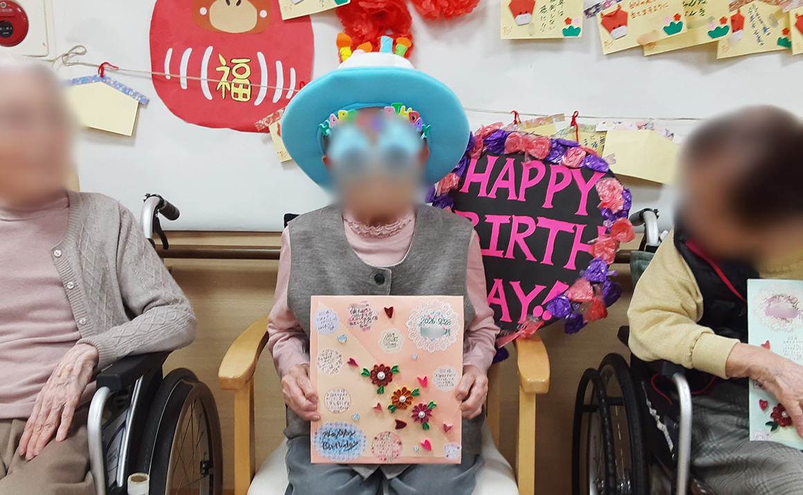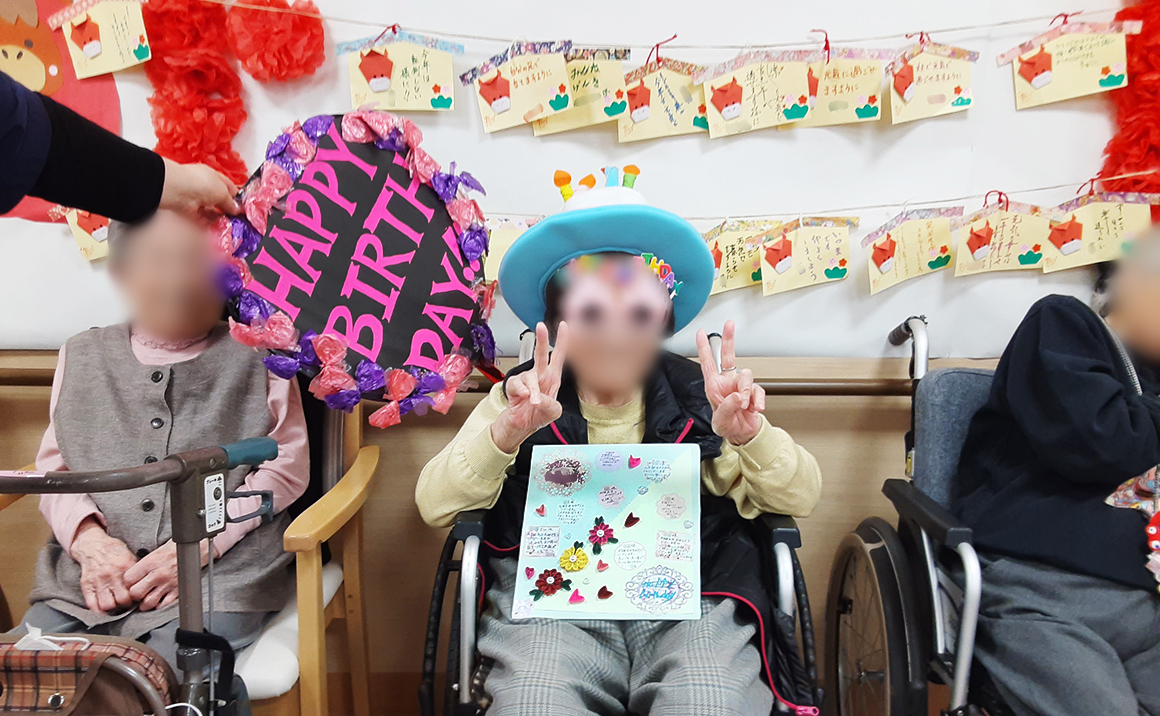 2月27日にお誕生日をお祝いしました。 スタッフから、メッセージが沢山記載された色紙をプレゼントで大喜びされていました。 お誕生日のお祝いは「この歳になっても嬉しいわ」と仰られます。誕生日会が始まり 「皆様に囲まれ、お誕生日をお祝いしてもらえるのは嬉しです」と笑顔で仰られます。 『ご入居さまにとって、お誕生日は年に一度の大イベントです』 これからも、ずっーと皆さまの誕生日をお祝いしていきたいと思います。