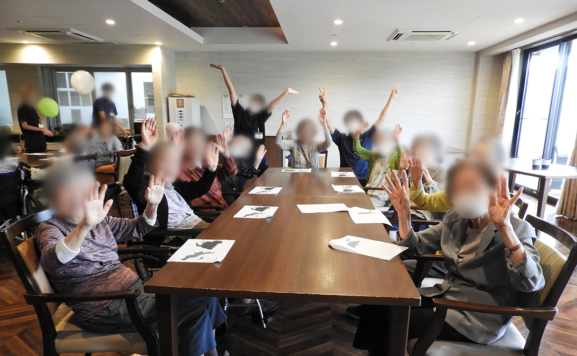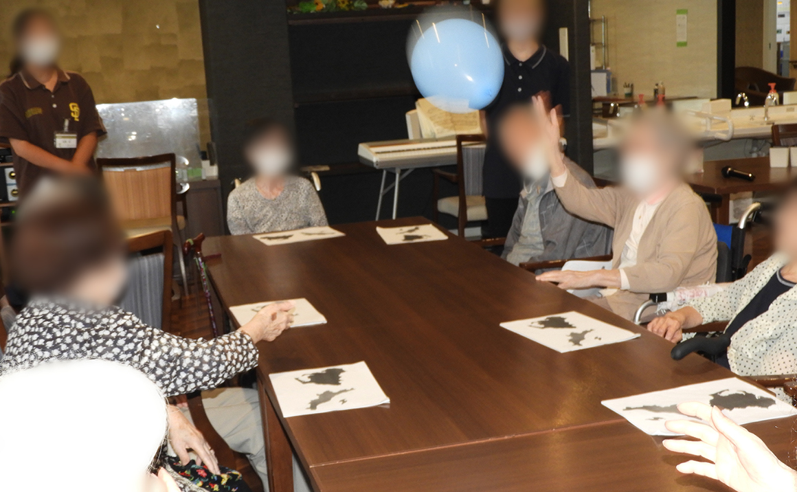 レクで風船バレーを月に1回~2回行っています。 毎回「新記録をつくる。」と、張り切って参加されています。 上半身の運動やリハビリにもなるとのことで人気のレクです。 8月8日は大学生の実習生(教育実習のプログラム)も参加して大盛り上がりでした。 ルールは床に落ちなければ続いているとしています。 机の上に落ちた場合は継続しているという特別ルールで実施しています。 記録達成し学生たちと万歳三唱でしめました。