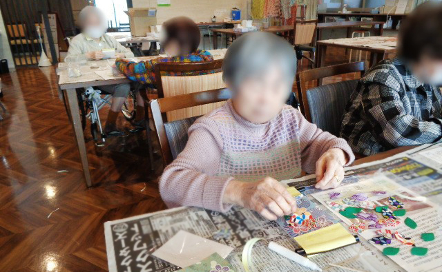 1月の工作は「タペストリー」づくりでした。このシニア工作の狙いは「作品をつくりながら機能訓練」を目指しています。