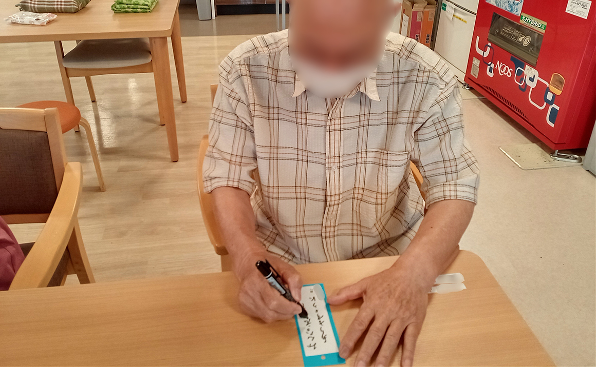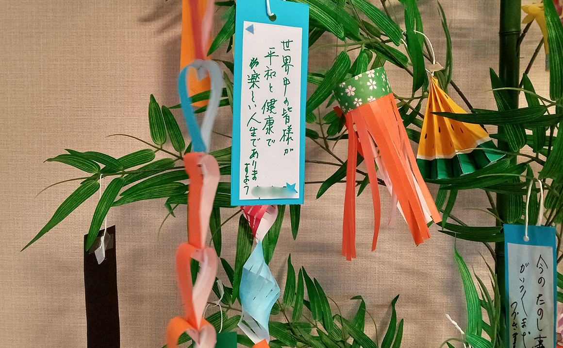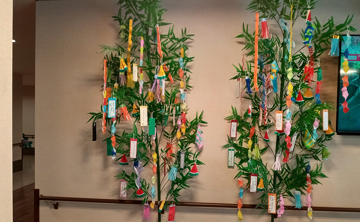 こんにちは!プレザンメゾン神戸白水より【七夕レク】の様子をご紹介いたします! 短冊に七夕のお願いごとを書いていただきました♪ 「何にしようかな~」と悩まれる方、すらすらと書かれる方・・・ 皆様それぞれの思いを書いて下さいました。 1階談話室に設置した笹に短冊と折り紙で作った七夕飾りをつけ、色とりどりの笹飾りが出来上がりました! 皆様の願いが叶いますように・・・☆彡