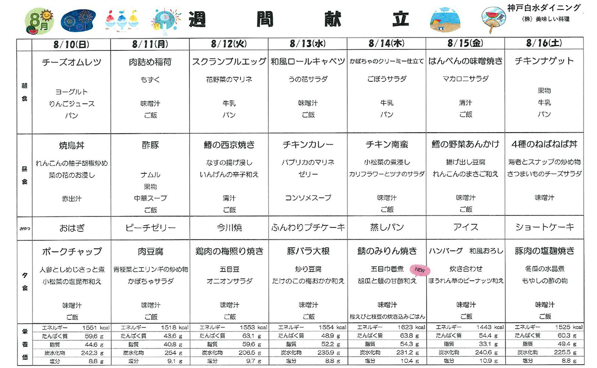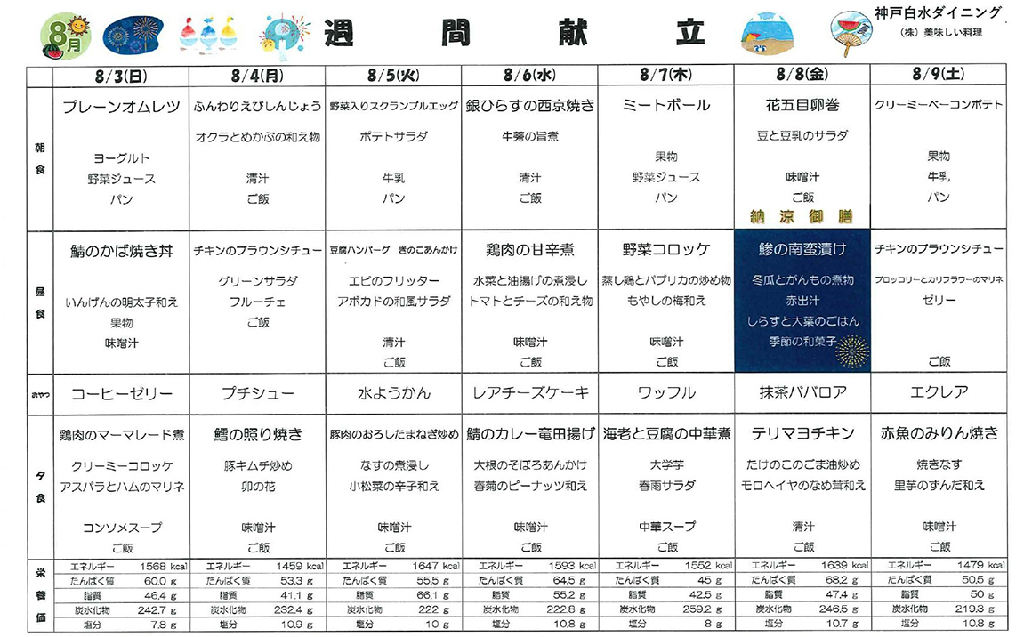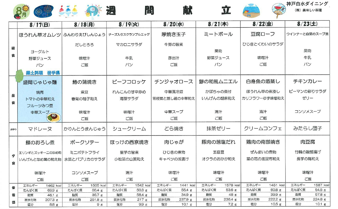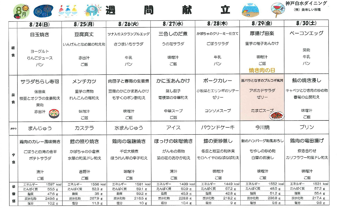 こんにちは! プレザンメゾン神戸白水より【8月献立表】を掲載いたします! 当施設では、ご利用者様の健康を第一に考え栄養バランスのとれた美味しいお食事をご提供しております。 季節の食材を活かした献立を考案し、食べる楽しみを感じていただけるよう工夫しております。 毎日の献立表では、主食・主菜・副菜・汁物の組み合わせを大切にし、彩り豊かで食べやすいメニューを心がけています。 また嚥下が難しい方には軟菜食やミキサー食などの対応もしており、安心して召し上がって頂く事ができます。