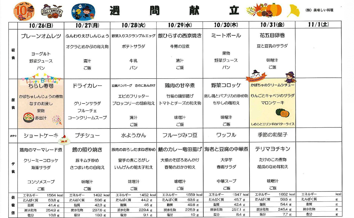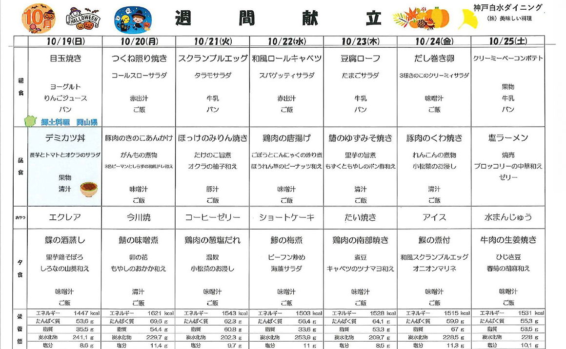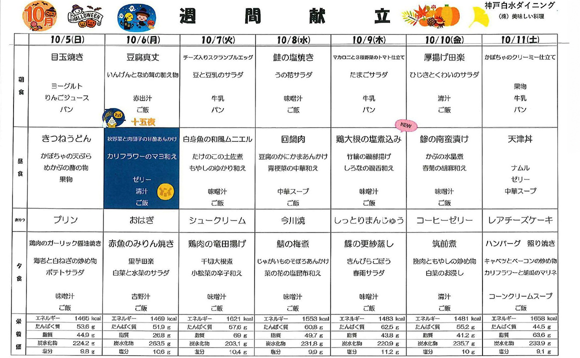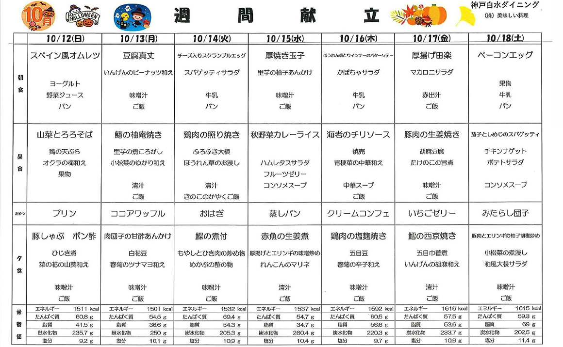 こんにちは! プレザンメゾン神戸白水【10月献立表】を掲載いたします。 当施設では、ご入居者様の健康を第一に考え栄養バランスのとれた美味しいお食事を提供しております。 季節の食材を活かした献立を考案し、食べる楽しみを感じていただけるよう工夫しております。 毎日の献立表では主食・主菜・副菜・汁物の組み合わせを大切にし、彩り豊かで食べやすいメニューを心がけています。 また、嚥下が難しい方にには刻み食やミキサー食などの対応もしており、安心して召し上がって頂くことができます(^^)
