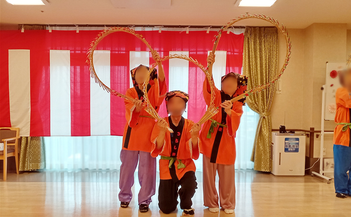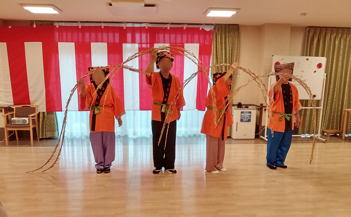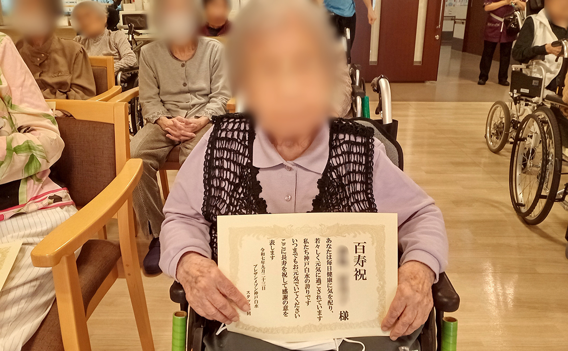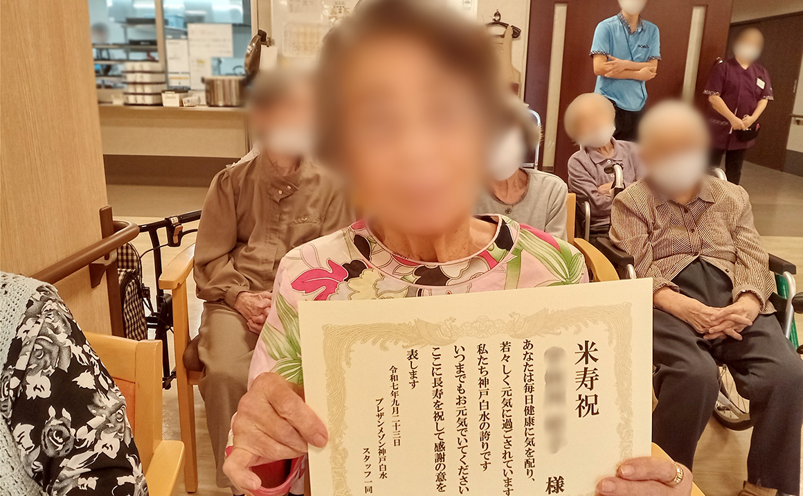 こんにちは! プレザンメゾン神戸白水より【敬老イベント】の様子をご紹介いたします! 9月23日(火)に敬老イベントを開催いたしました。 今年は百寿2名・卒寿1名・米寿2名のお祝いと皆様への感謝を込めて施設よりプレゼントをお渡ししました♪ ボランティアグループうらしまたろうさんによる踊りや歌、銭太鼓・南京玉すだれを披露していただき、 皆様に楽しい時間を過ごしていただきました(^^♪ これからも末永くお元気でいてくださいね!