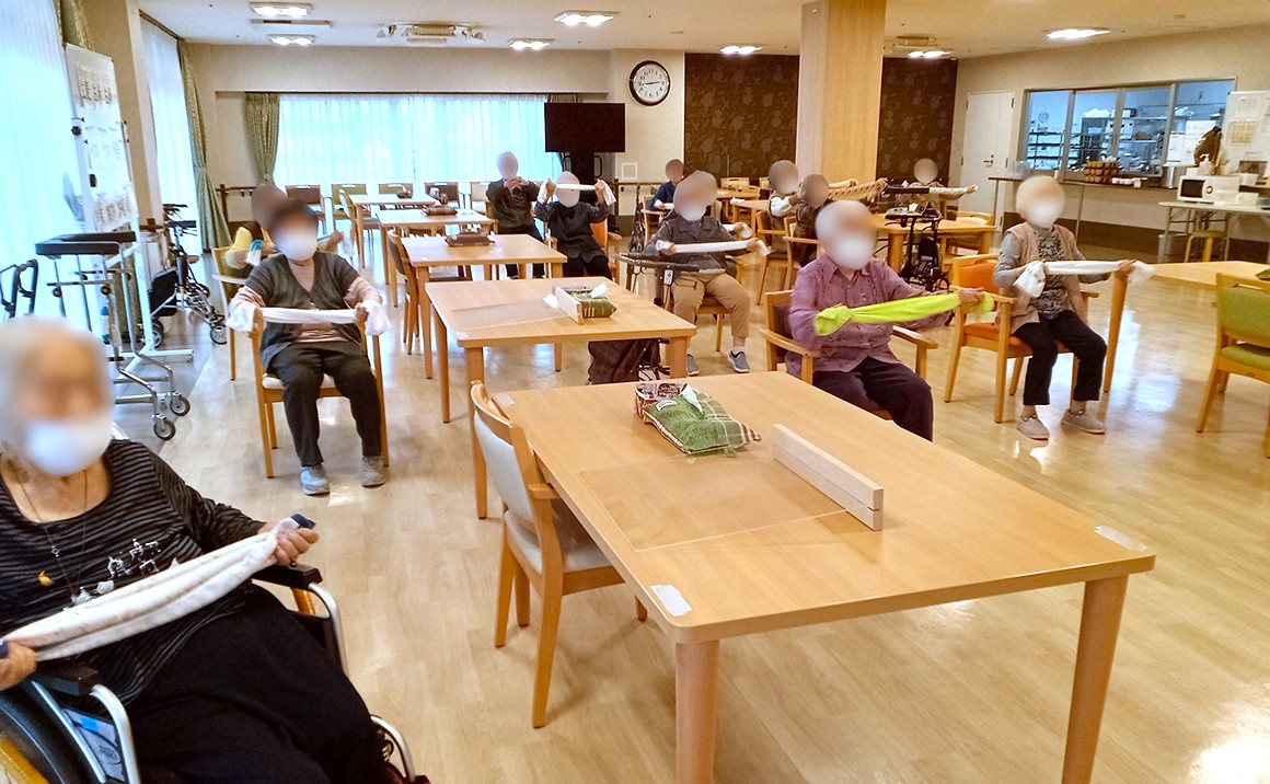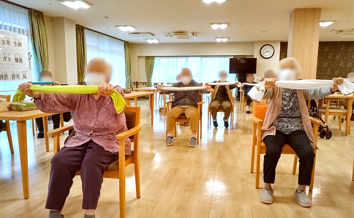 プレザンメゾン神戸白水より【健康体操】の様子をご紹介いたします! 当施設では週に一回、訪問マッサージ事業所による【健康体操】を開催しております。 今回はタオルを使った体操を教えて頂きました。 タオルの端を持って腕を伸ばしたり、曲げたりすることで肩甲骨や背中の ストレッチを行います! 毎回、職員も一緒に参加させて頂き皆様と一緒に体操を楽しんでおります♪