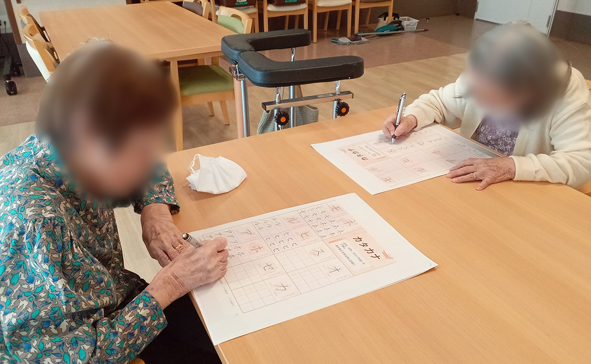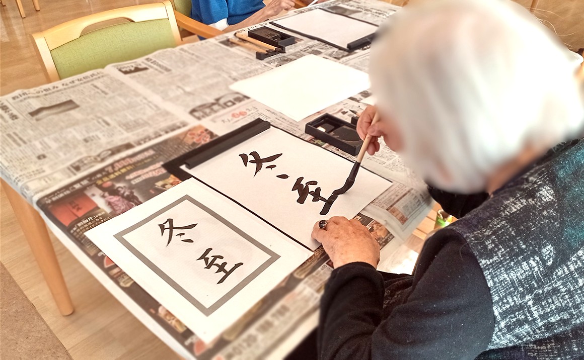 プレザンメゾン神戸白水より【お習字レク】の様子をご紹介いたします! 季節に合わせたお手本を用意し、毛筆とボールペン字のどちらかお好きな方を選んで頂いております。 参加の皆様は真剣な表情で取り組まれ、何枚も書かれた中から清書を選んでおられました(^^)