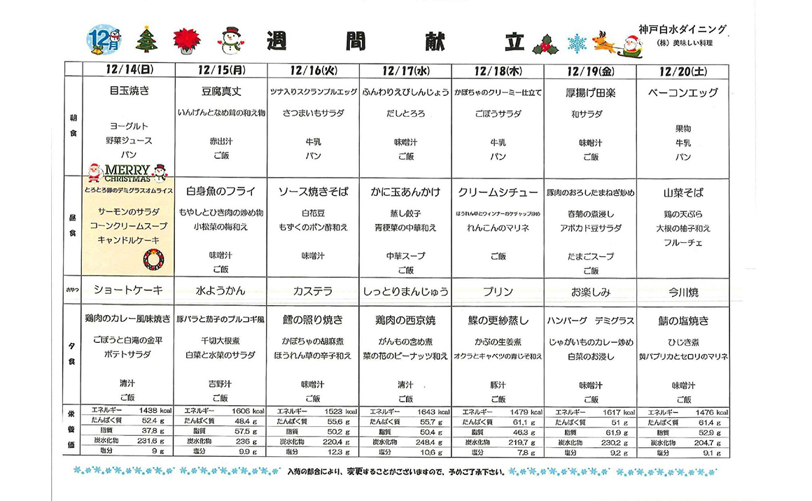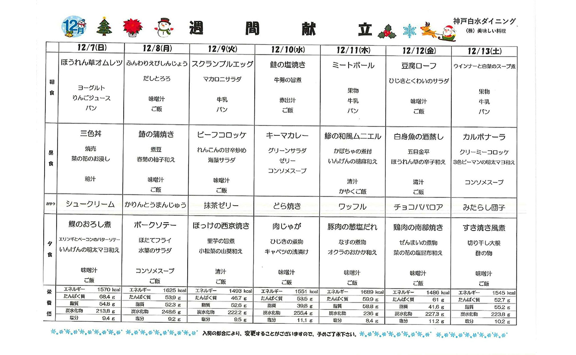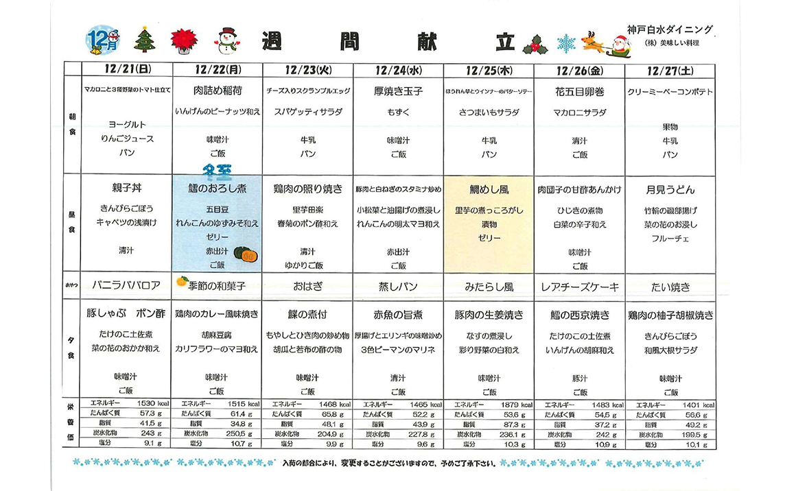 プレザンメゾン神戸白水より【12月献立表】を掲載いたします! 当施設では、ご利用者様の健康を第一に考え栄養バランスのとれた美味しいお食事をご提供しております。 季節の食材を活かした献立を考案し、食べる楽しみを感じていただけるよう工夫しております。 毎日の献立表では、主食・主菜・副菜・汁物の組み合わせを大切にし、彩り豊かで食べやすいメニューを心がけています。 また嚥下が難しい方には軟菜食やミキサー食などの対応もしており、安心して召し上がって頂く事ができます。
