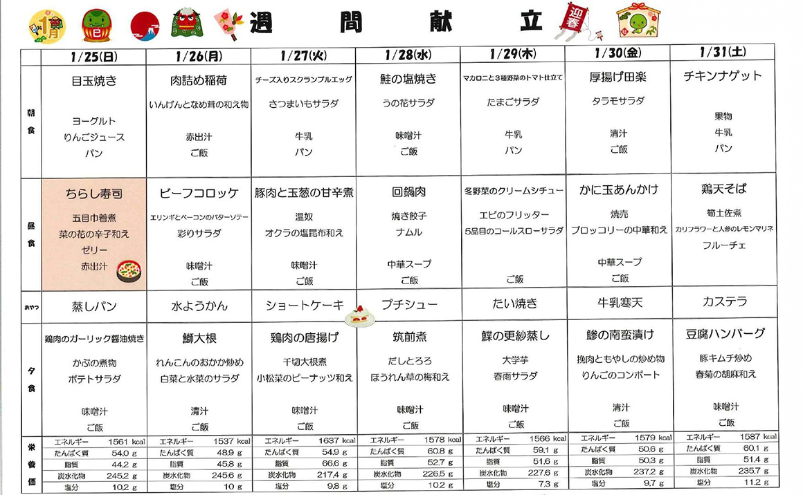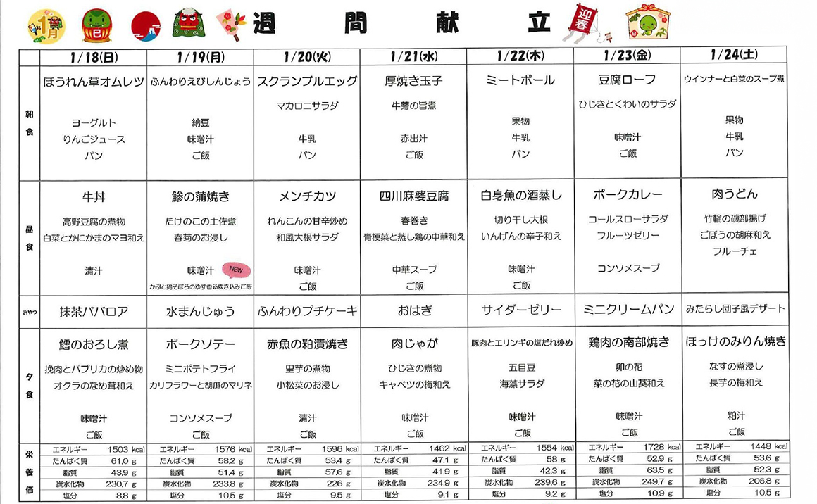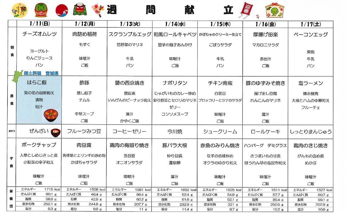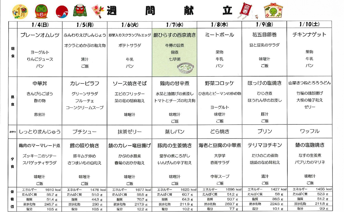 プレザンメゾン神戸白水より【1月献立表】を掲載いたします! 当施設では栄養バランスはもちろん、季節に合わせたお食事を提供しております。 今月は新年にちなんだ、おせち料理や七草粥でお正月気分を味わって頂きます♪ かみ合わせや嚥下状態に合わせた形態のお食事にも対応しております。 毎日のお食事を、安心して美味しく楽しく召し上がって頂けるよう取り組んでおります。
