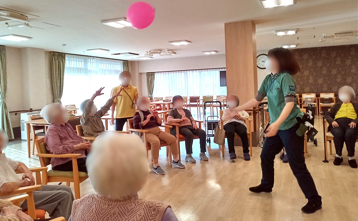 プレザンメゾン神戸白水より【風船バレー】の様子を紹介いたします! レクリエーションで風船バレーをしていただきました。 皆様、ゲームになると真剣や笑顔など表情豊かになられます(^^) 毎日の体操に加えて体を動かす機会を増やして頂けるよう、 レクリエーションに取り組んでおります♪