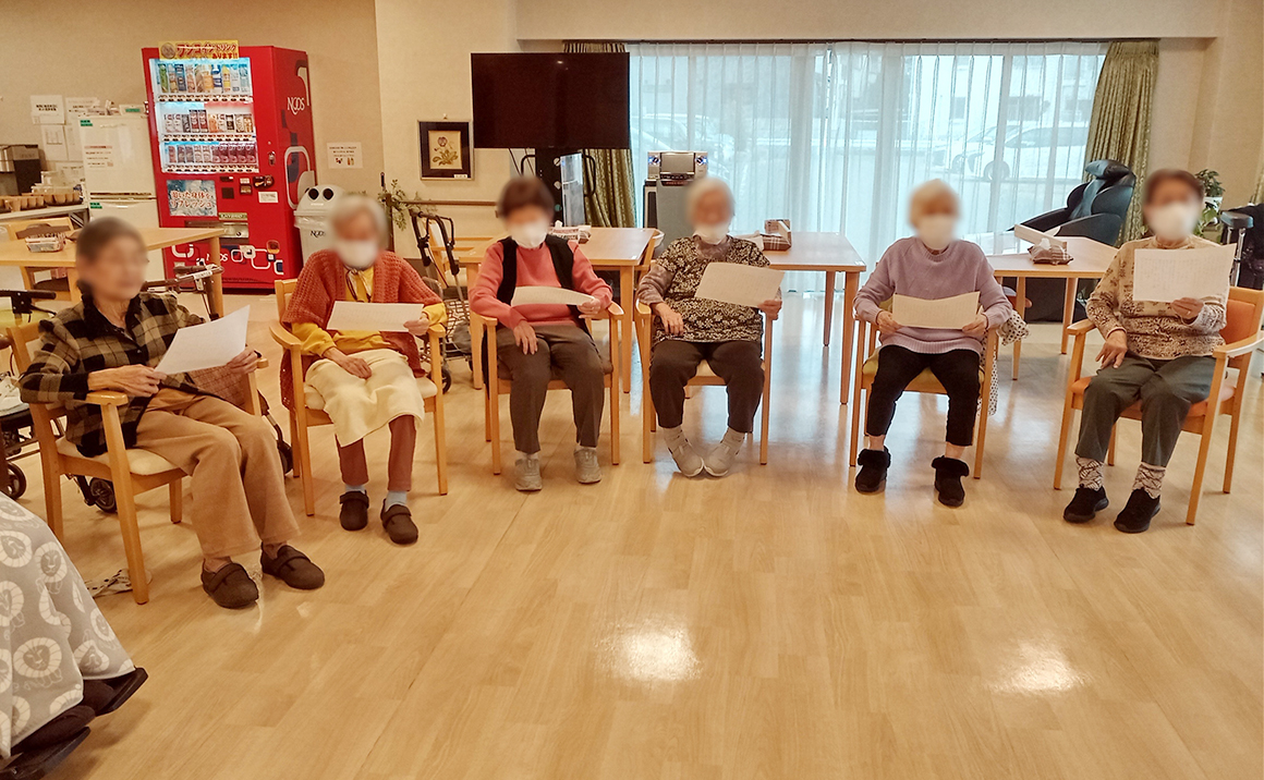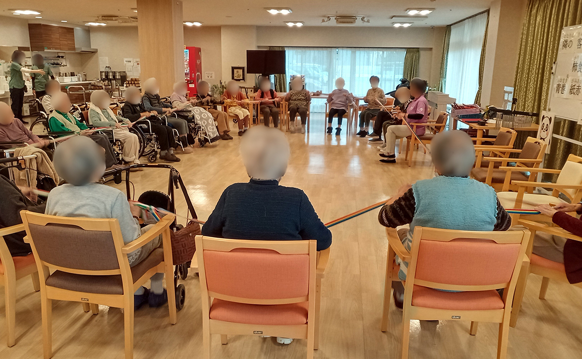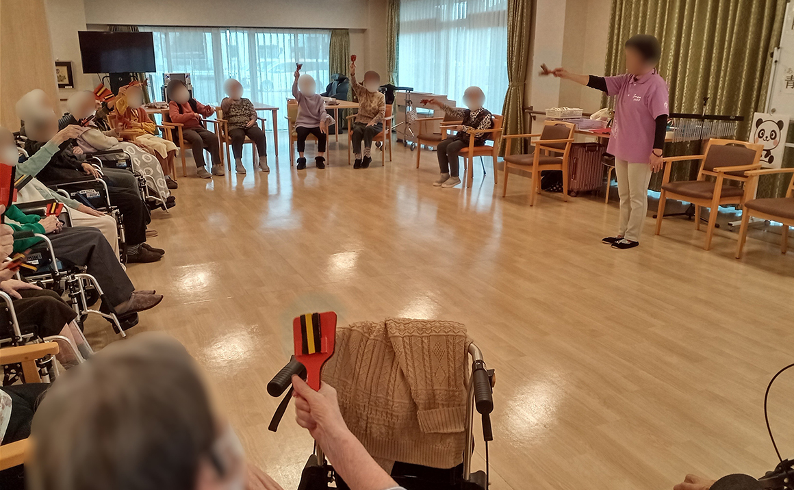 当施設では毎月、ボランティアによる【ミュージックケア】を開催しております♪ 体操・楽器・歌をみなさんで楽しんで頂く音楽療法で 毎月の楽しみのひとつとなっています(^^) 鳴子や鈴を音楽に合わせて演奏したり、シンバルや太鼓も交えての合奏を行ったり 懐かしい歌を合唱したり・・・ 刺激のある時間を過ごして頂いております♬