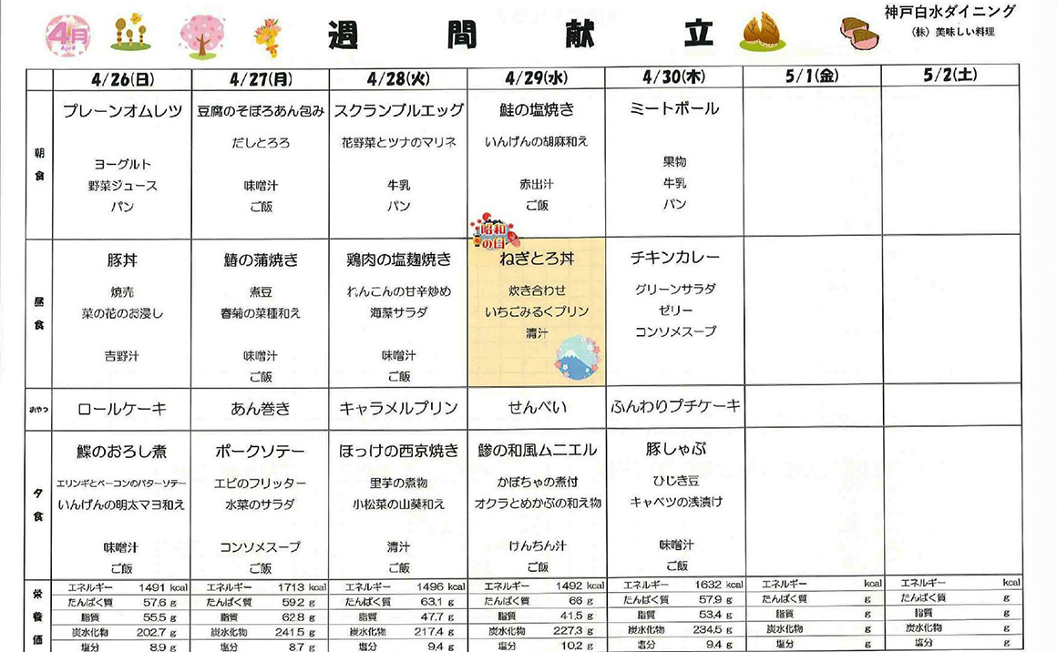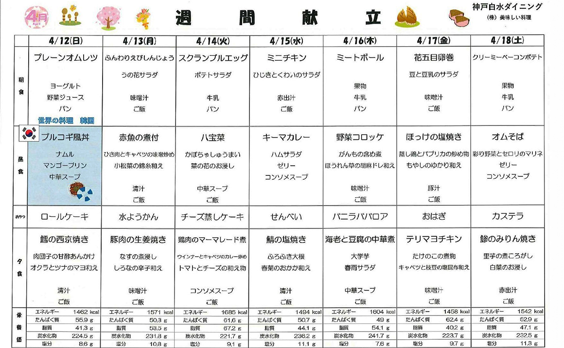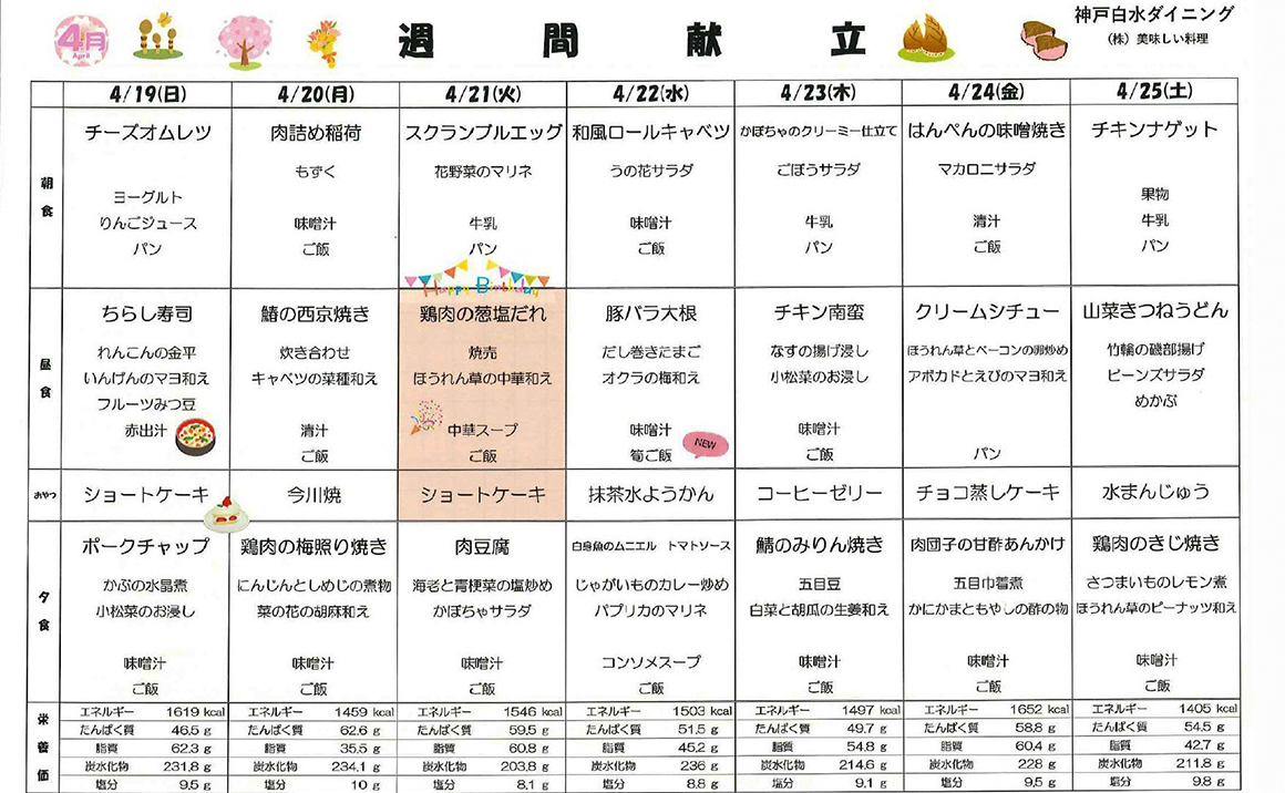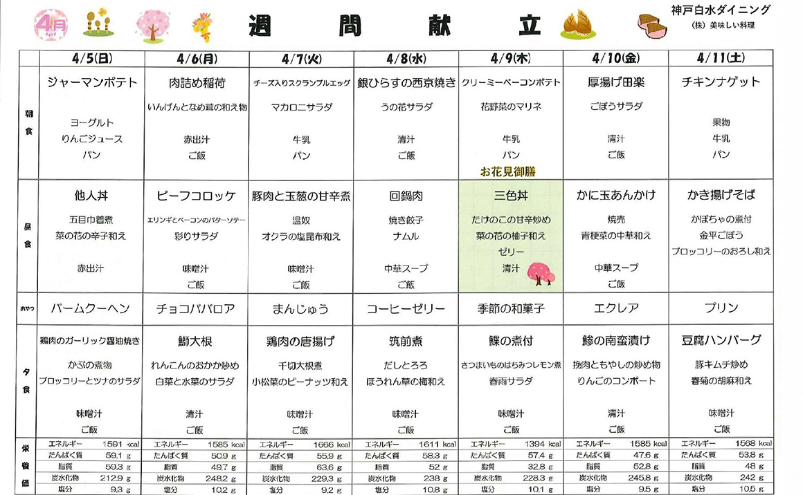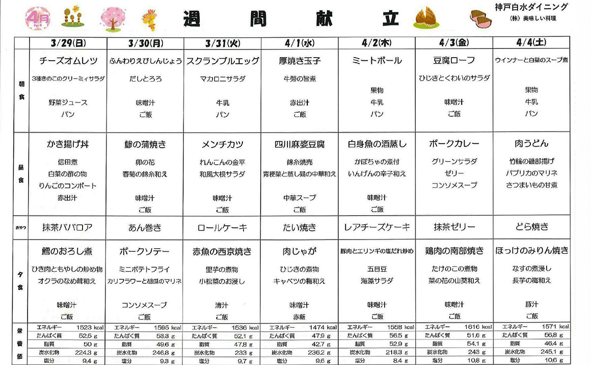 プレザンメゾン神戸白水【4月の施設献立表】を掲載いたします!