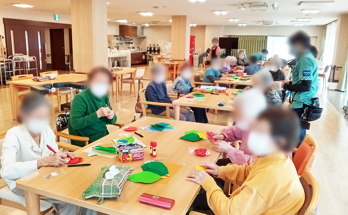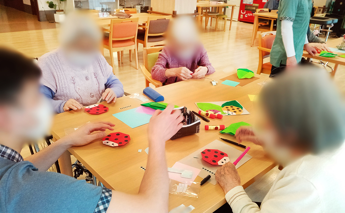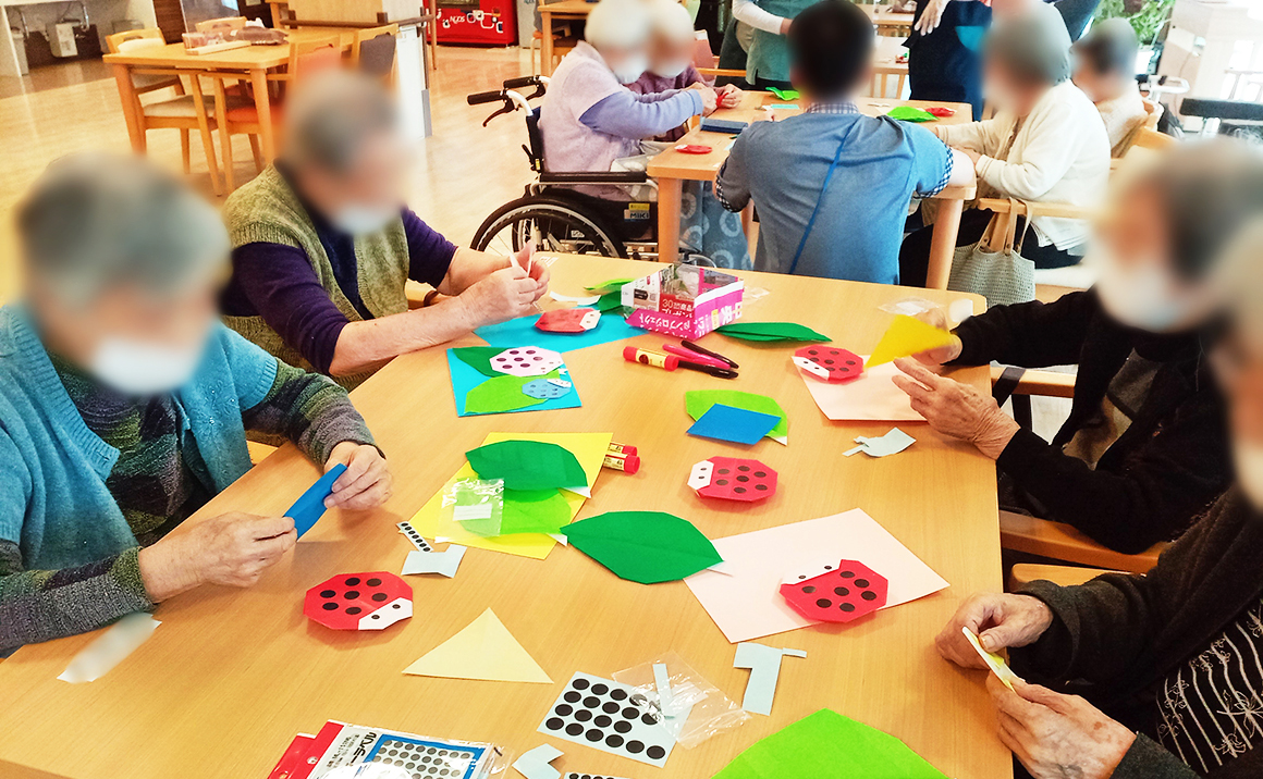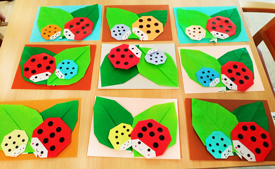 プレザンメゾン神戸白水より【おりがみレク】の様子ををご紹介いたします! 毎月、季節に合わせた作品を作って頂いております。 今月のテーマは てんとう虫 です(^^) 葉っぱの上に可愛いてんとう虫が2匹🐞🐞 みなさん、シールを貼るのが少し大変そうでしたが、可愛らしい作品が出来上がりました♪