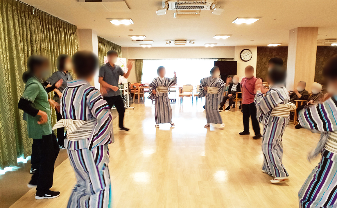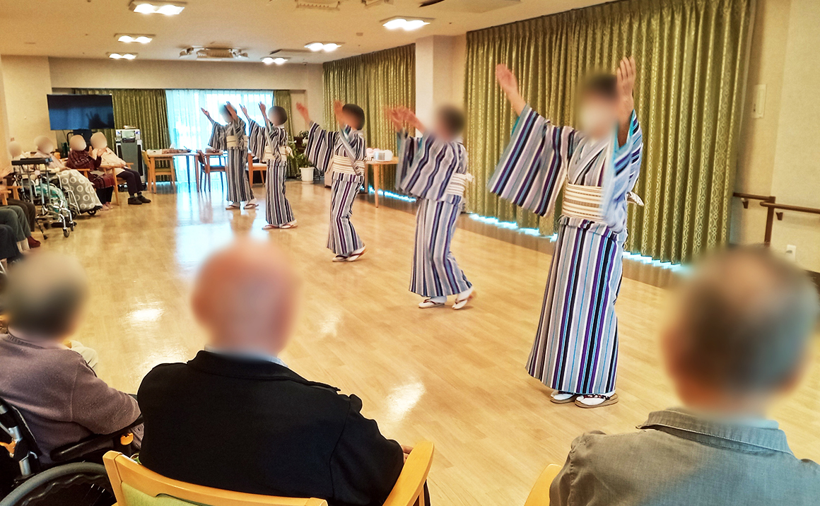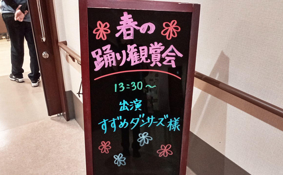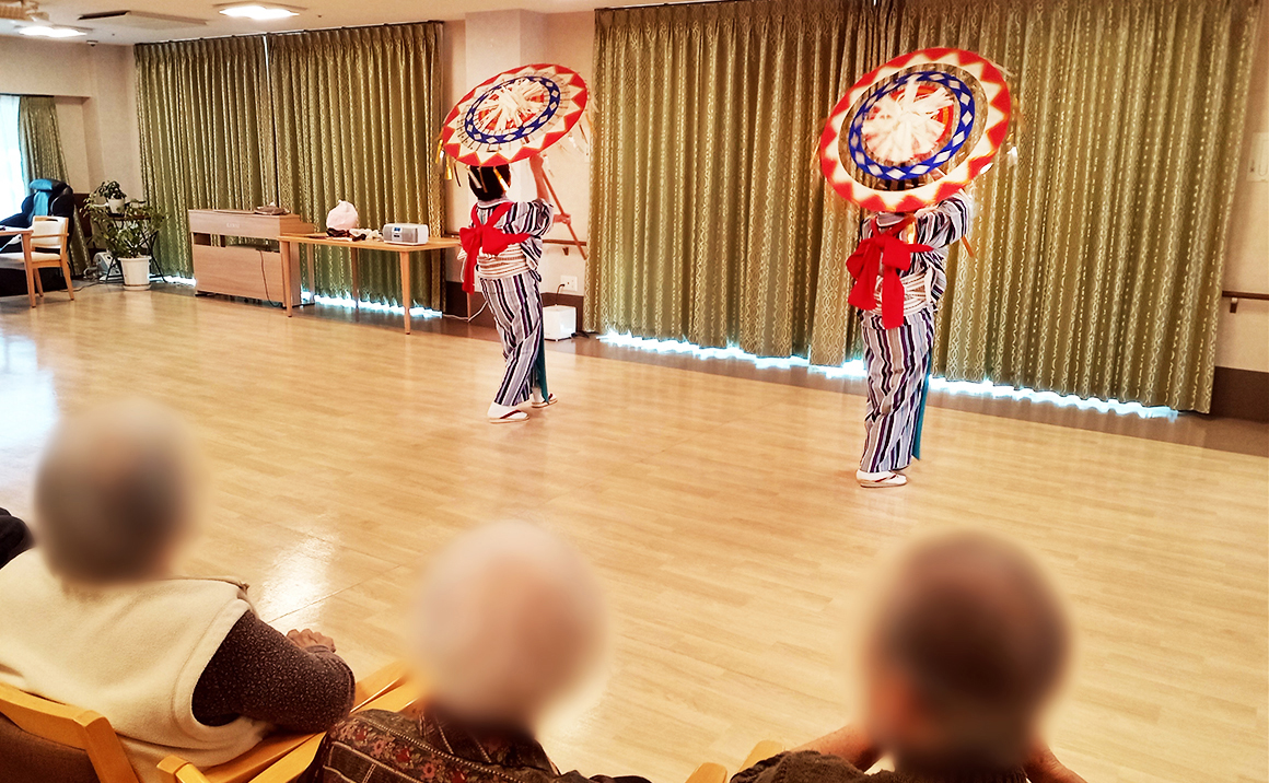 プレザンメゾン神戸白水より【春の踊り観賞会】の様子ををご紹介いたします! ボランティアグループ すずめダンサーズさんによる踊りを楽しんで頂きました♪ 綺麗な着物や傘・うちわ・花飾りなどで、とても華やかで楽しい時間を過ごして頂きました。 最後にスタッフも踊りに参加し、ボランティアさんもスタッフも汗をかきながら ダンシングヒーローを踊って締めくくりました(^^)