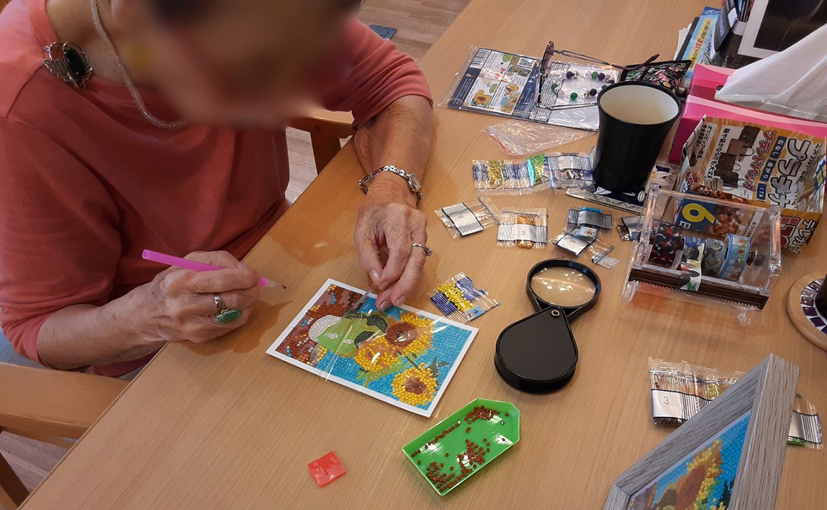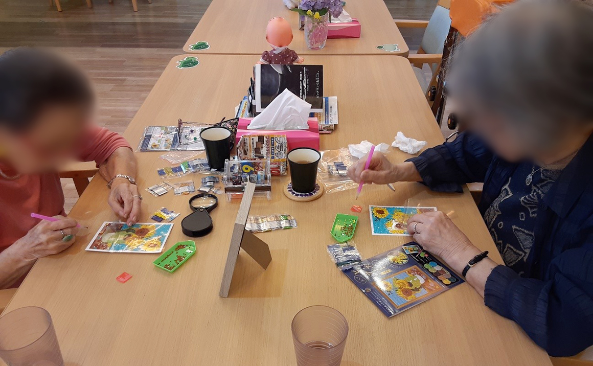 今回は入居者様が「私が教える」とのことで朝食後コツコツと作業されていました。