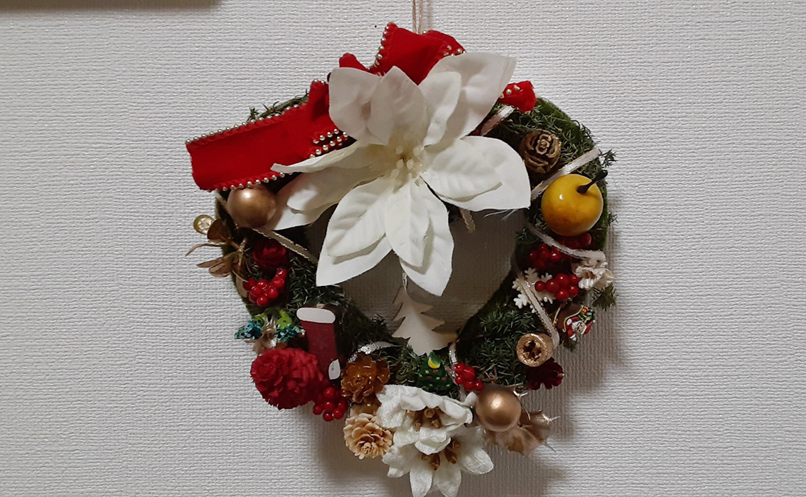 フラワーアレンジメントは皆さん思い思いに飾り付けをし、 素敵なクリスマスリースが出来上がりました
