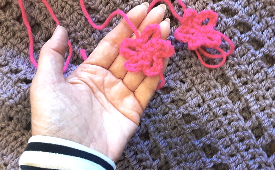 コツコツと編み進めてきた大作も、いよいよ完成間近となりました。仕上げは手作りのお花を作って取り付ける工程です。
