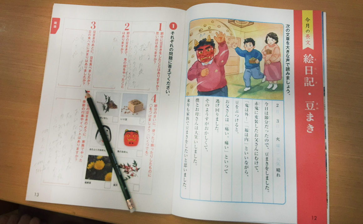 初回の本日は国語 節分の豆まきの思い出などを思い出しながら記入していただきました!!