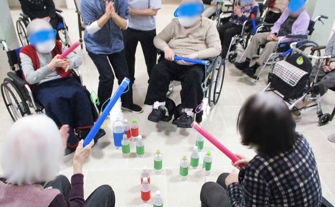 倒れているペットボトルを輪っかに引っかけて立てるというレクで利用様皆さま楽しまれました。