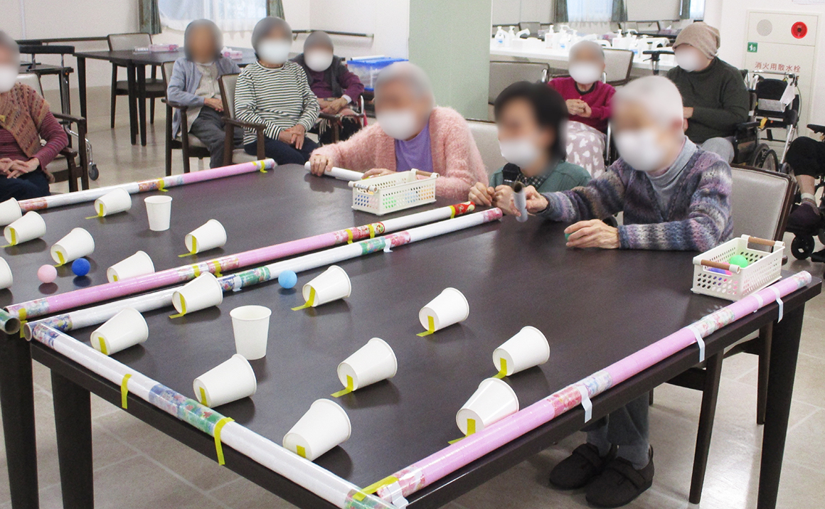 コップ引き寄せゲームで楽しく過ごされる