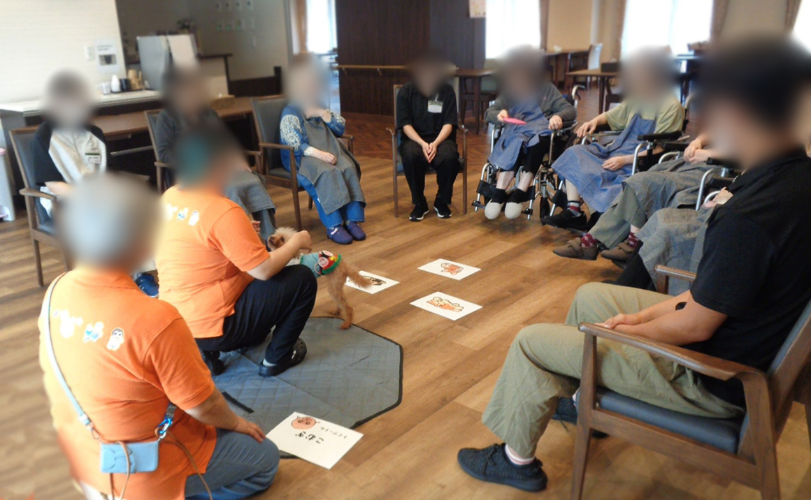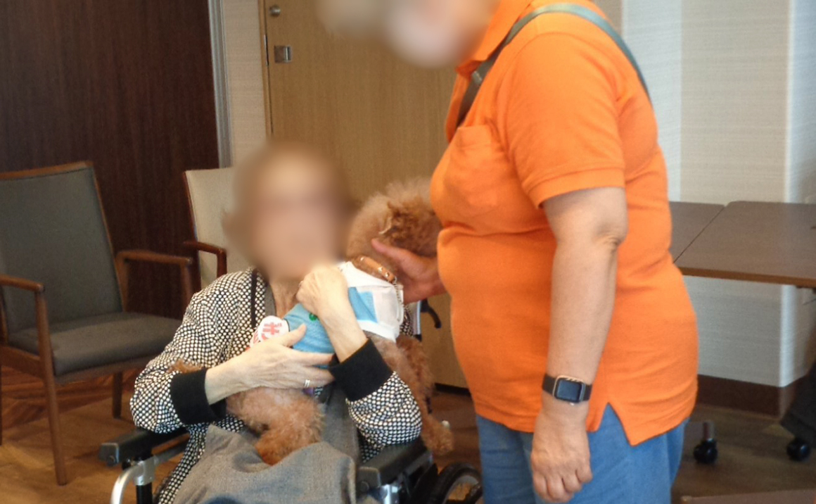 月に1回、アニマルセラピーのイベントを開催してます。 外部に依頼して色々な犬が2匹来てくれます。今回はトイプードルが2匹来てくれました。 トレーニングを受けている犬なので人間が触っても噛んだり、吠えたりしません。 くるっと回る一芸も披露してくれました。入居者様がも職員もとても癒されるひとときでした。