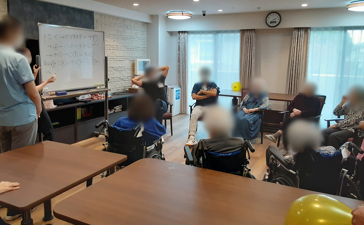 大学生が5人介護体験に5日間来てくださいました。 最終日に大学生が考えた催し物を行うことになっていて、風船バレー、しりとり、後出しじゃんけんを行いました。 大変盛り上がり、入居者様のテンションも上がっていました。 とても素敵な5日間になりました。