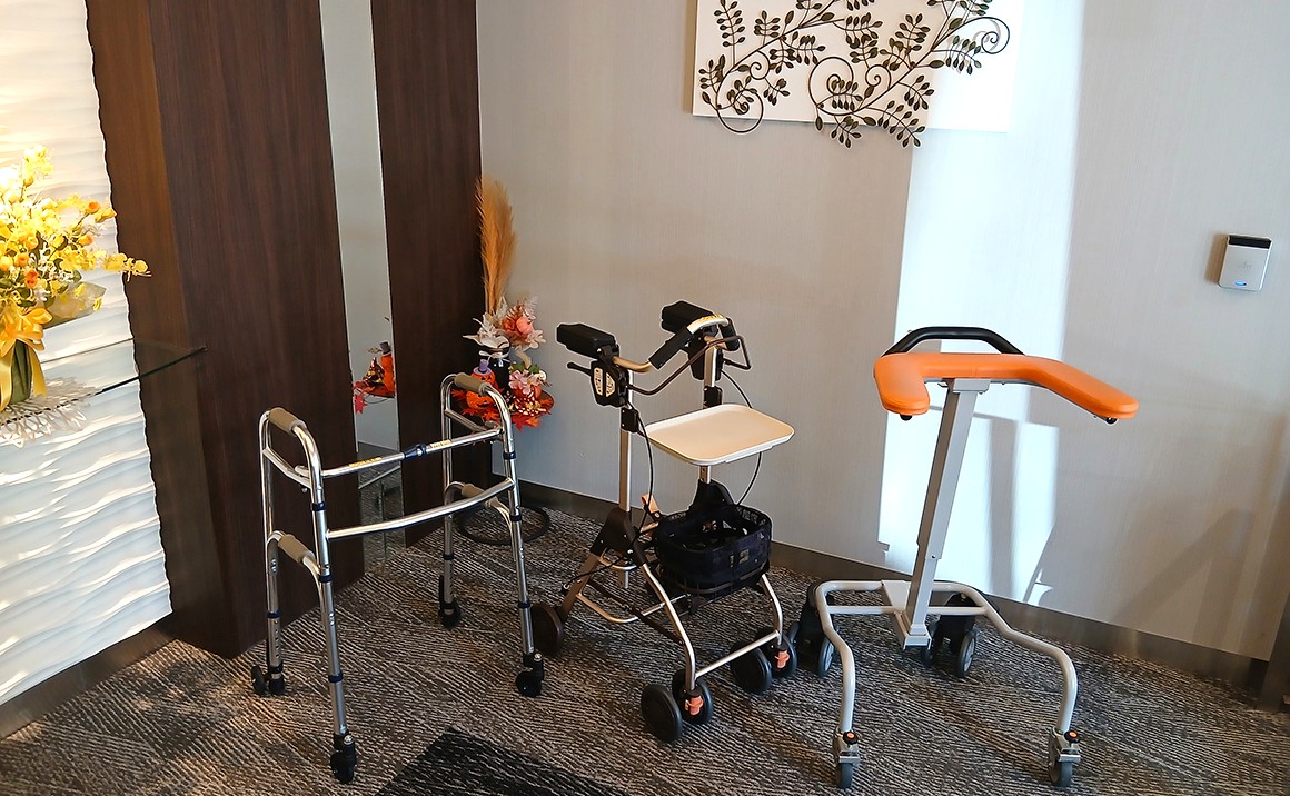高齢者は、年齢を重ねてくると、歩行や移動に何らかの手助けが必要な方が多くなります。 特に、ご自宅や病院等から老人ホーム入居となりますと、大きな環境の変化を伴います。 当ホームでは、福祉用具専門相談員や福祉住環境コーディネーター、リハビリ専門員(療法士)がおりますので、 福祉用具が必要な場合には、ご利用者様にマッチした車椅子や歩行器の選定のお手伝いをしており、施設備品の貸出も行っています。 入居後も身体機能の変化に応じたご提案をいたします。お気軽にお問い合わせください。