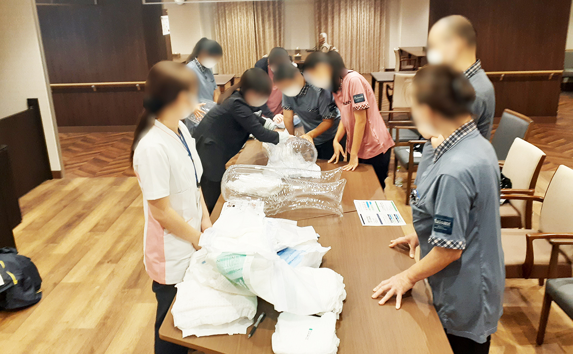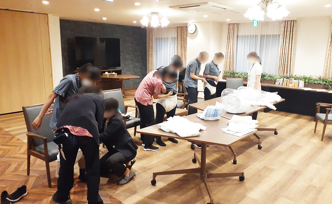 当施設のスタッフは、日頃から介護技術をはじめ様々なテーマで研鑽に励んでいます。 今回は、外部講師を招いて、おむつなどの排泄用品の使い方の研修を行いました。 排泄用品は日々進化していますので、それぞれの商品のメリットを知り、使いこなしていくことが重要なポイントとなります。 実際に、自分で装着してみて履き心地を確かめたり、実際に水を含ませてみたりして、排泄介助の基本を学びました。