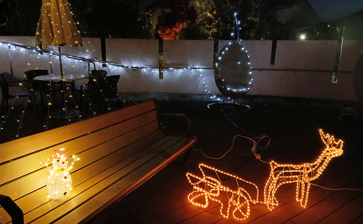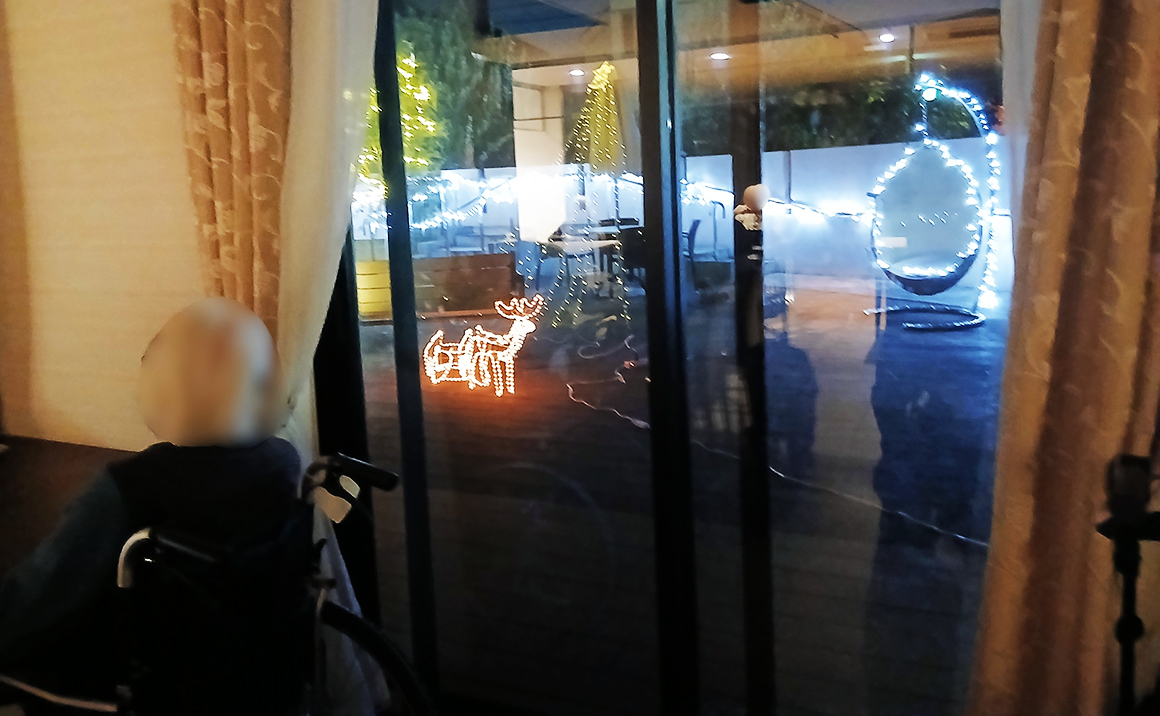 テラスでイルミネーションの飾り付けを終え、夕食前の点灯式まで職員もワクワクドキドキ・・・