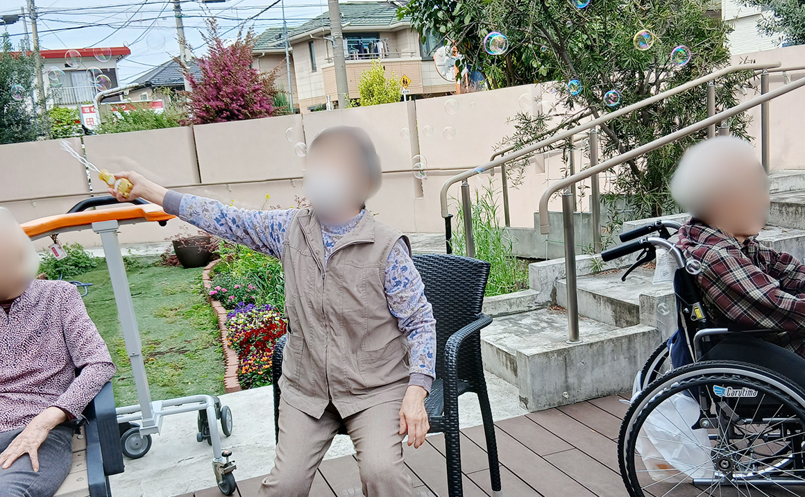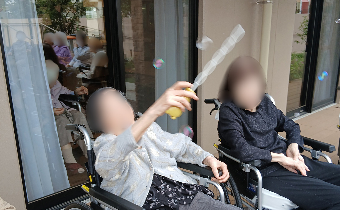 ぽかぽか陽気の中、皆様とご一緒にテラスでしゃぼん玉をしました(*^^*)