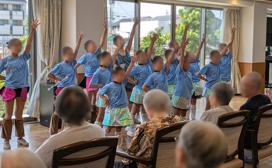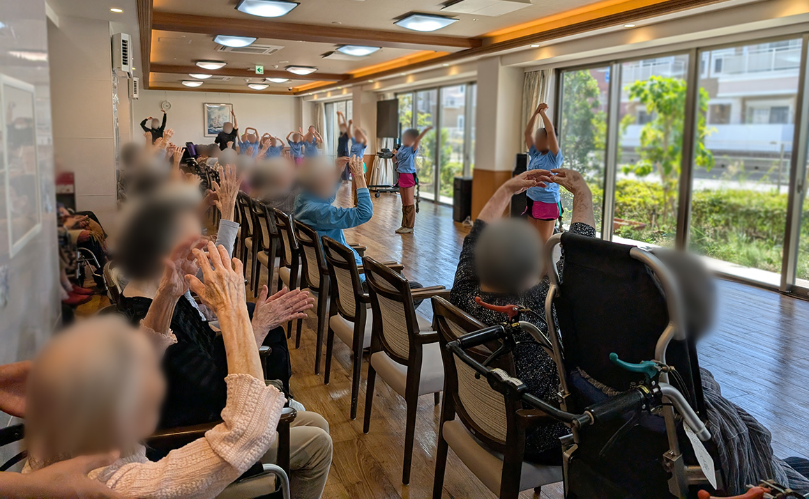 猫耳のついた可愛い衣装で演技していただきました。 一緒に腕を動かしたりと、上手に指導もしていただきました。 幼稚園から中学生までの可愛い女の子たちにご入居者の皆様も目を細めていらっしゃいました。