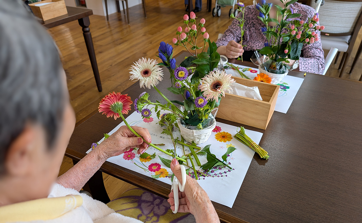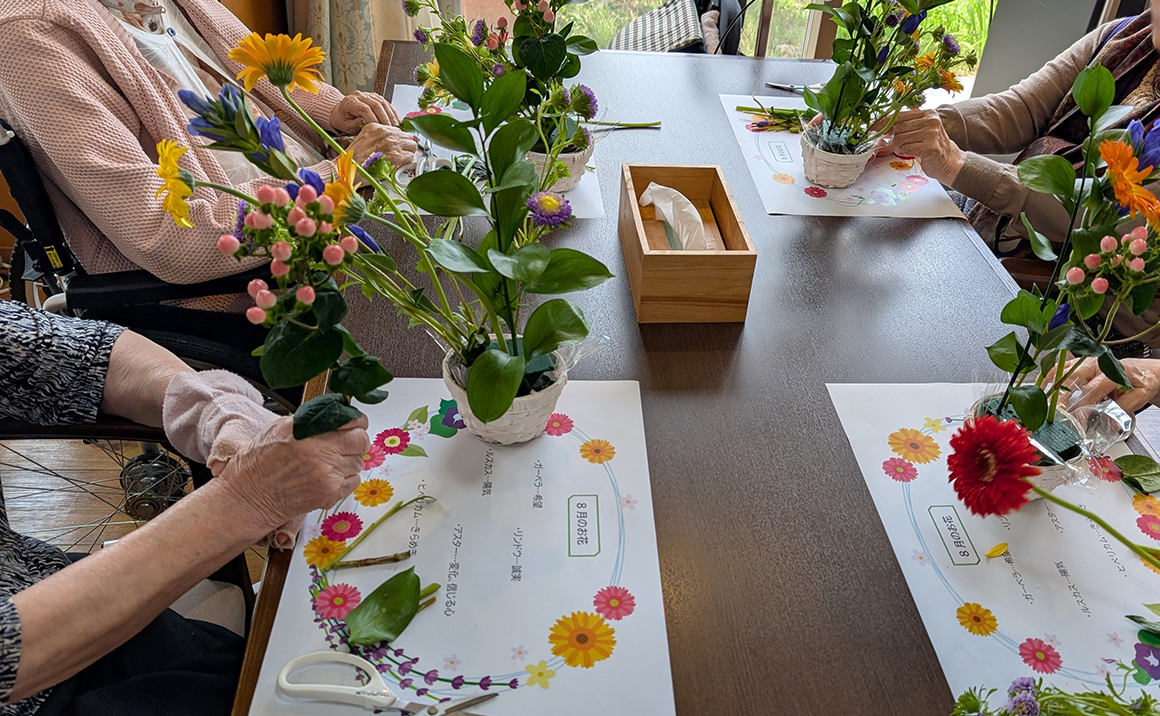 プレザングラン門戸厄神では有料レクリエーションで毎月フラワーアレンジメントを実施しております。
